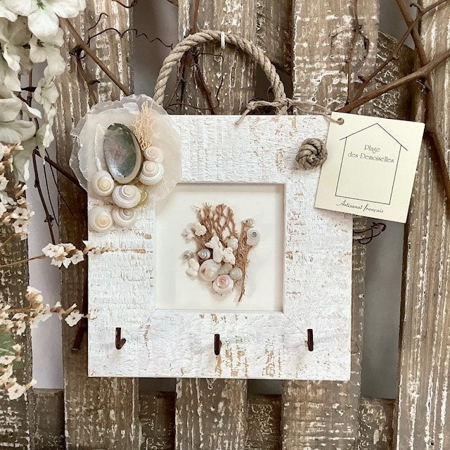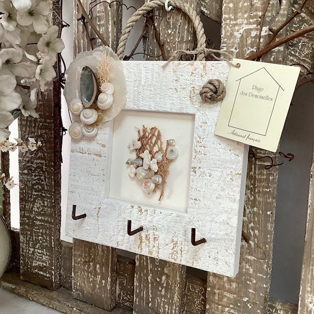 Un petit cadre accroche clés ou autres…vintage de la marque Plage des Demoiselles Artisanat Français. En bois blanchi avec nacre, coquillages et trois accroches. Neuf avec étiquette