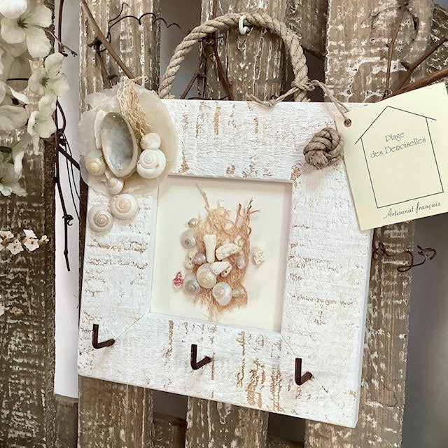 Un petit cadre accroche clés vintage de la marque Plage des Demoiselles Artisanat Français. En bois blanchi avec nacre, coquillages et trois accroches. Neuf avec étiquette