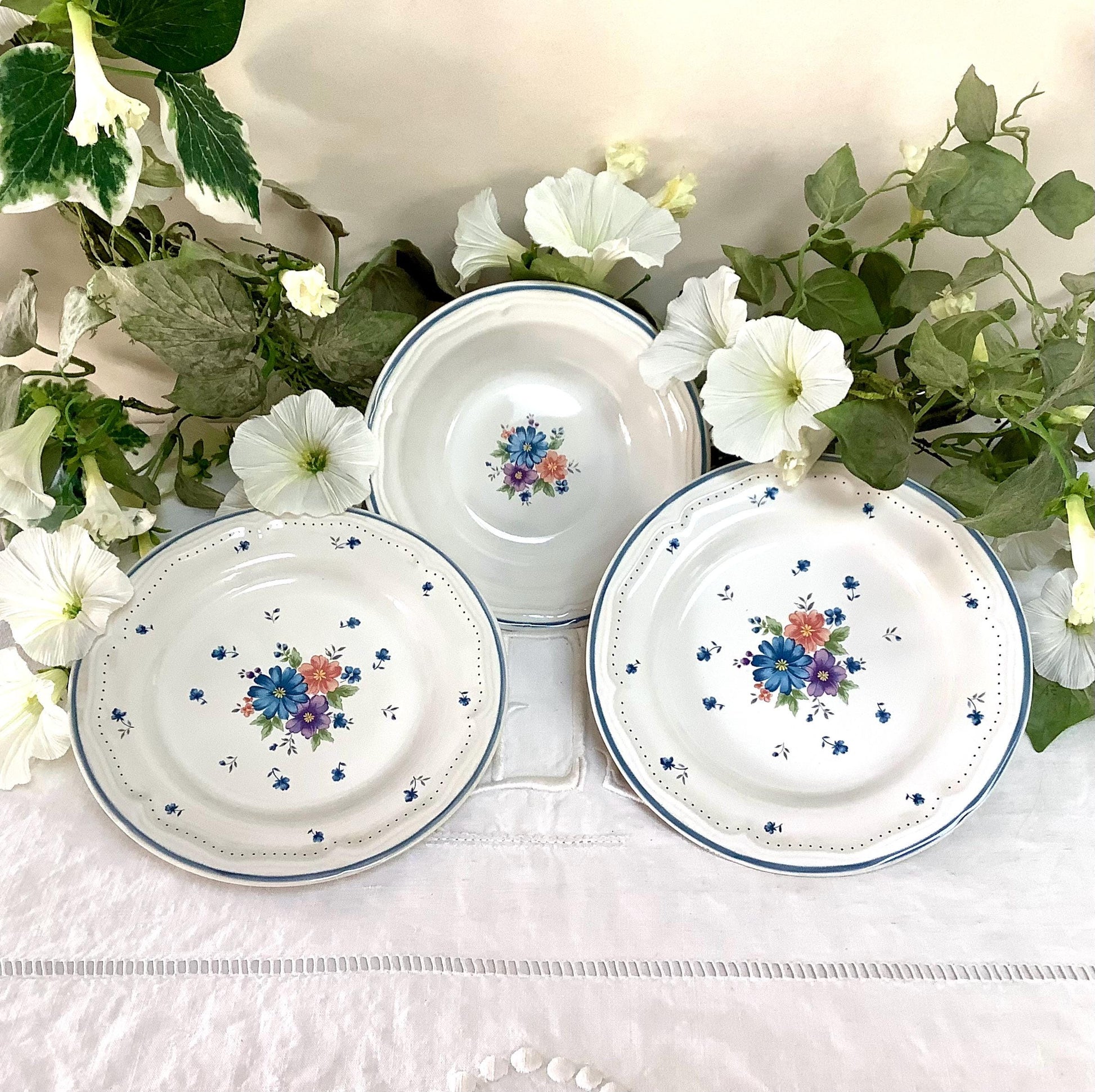 Deux petites assiettes à dessert et une coupelle vintage en grès émaillé très résistant provincial bouquet Vintage des années 1980. Motifs floraux. Très bon état. Passe au four, micro-onde, congélateur et lave-vaisselle.