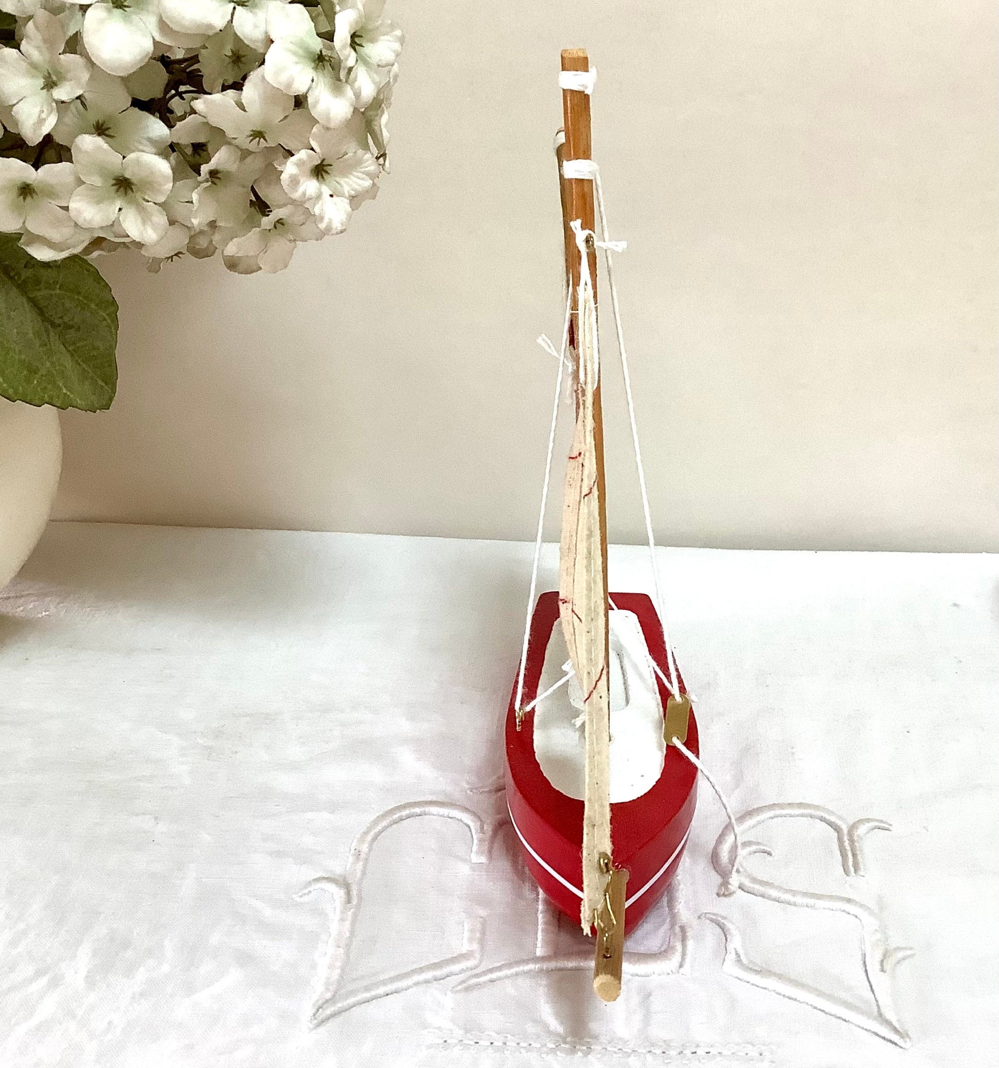 Pour jouer dans l’eau, bateau flottant rouge et blanc en bois avec voiles de coton, Très jolie qualité, état neuf.