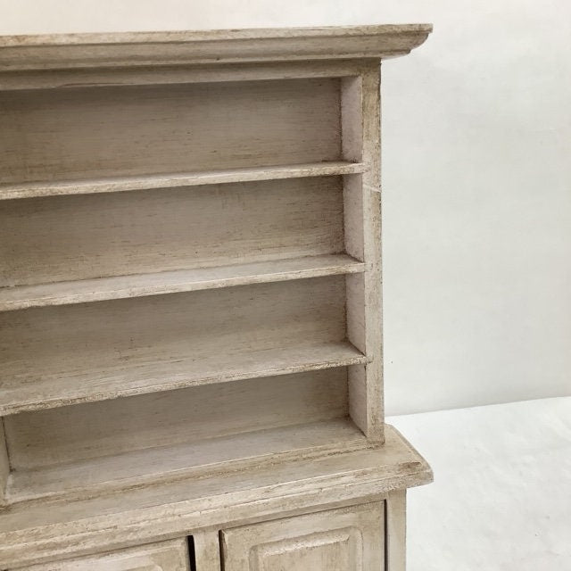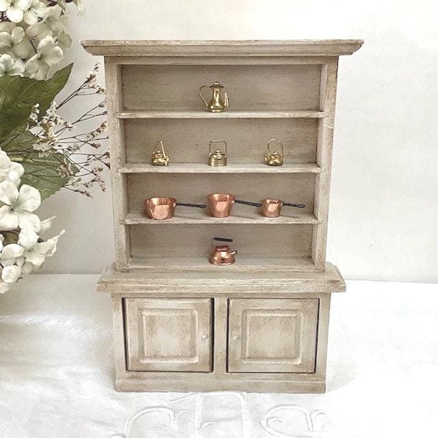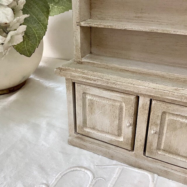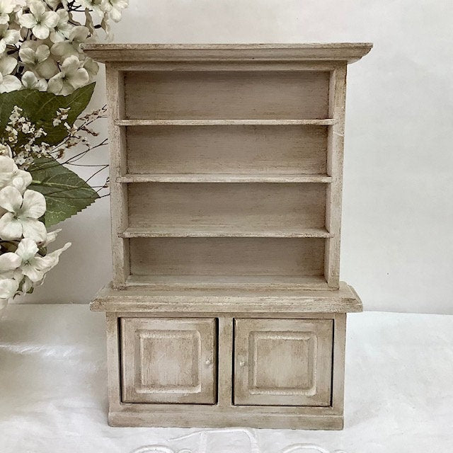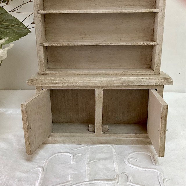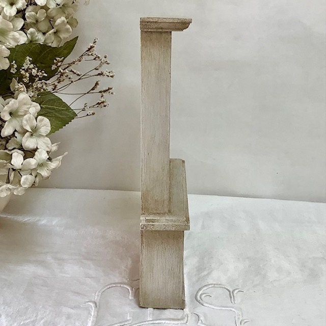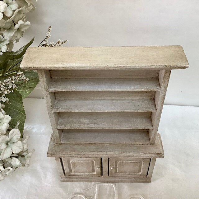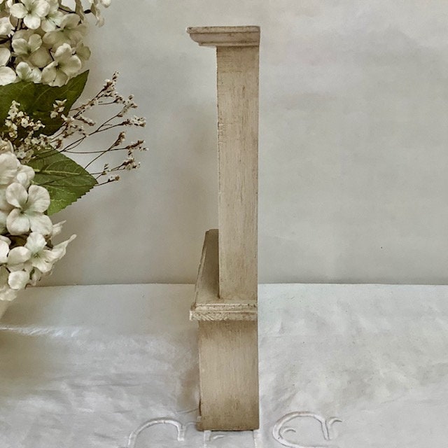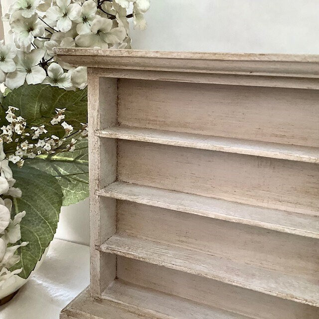 Petite bibliothèque miniature en bois repeinte et patinée pour effet vintage. Parfaite pour exposer des mini collections ou pour maison de poupée. Entretien chiffon doux