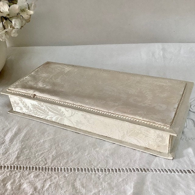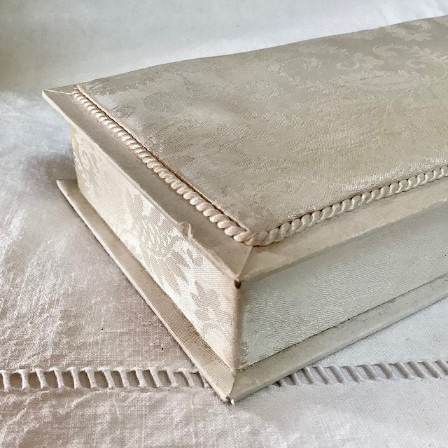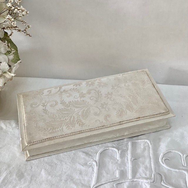 Boîte ancienne en satin couleur crème, ivoire avec passementerie. Bon état, quelques traces d’usage. (voir photos)