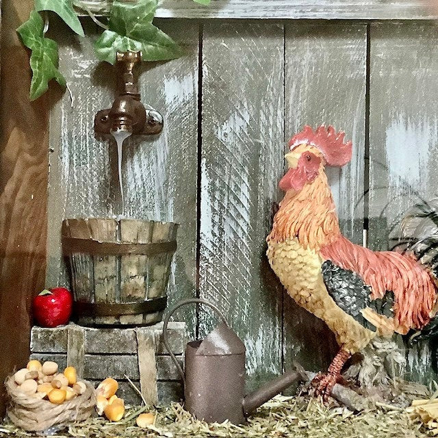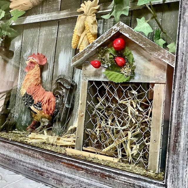 Cadre vitrine miniature poulailler coq vintage