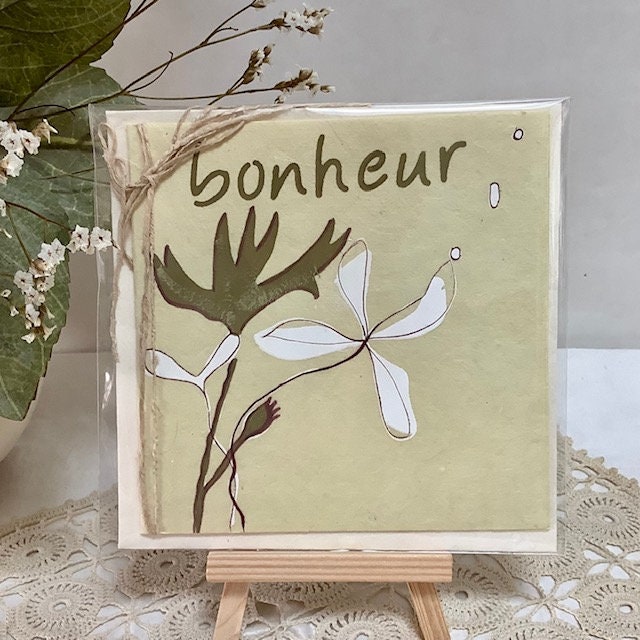 Grande carte double avec enveloppe en papier artisanal type mûrier. Thème Bonheur. État neuf sous cellophane.