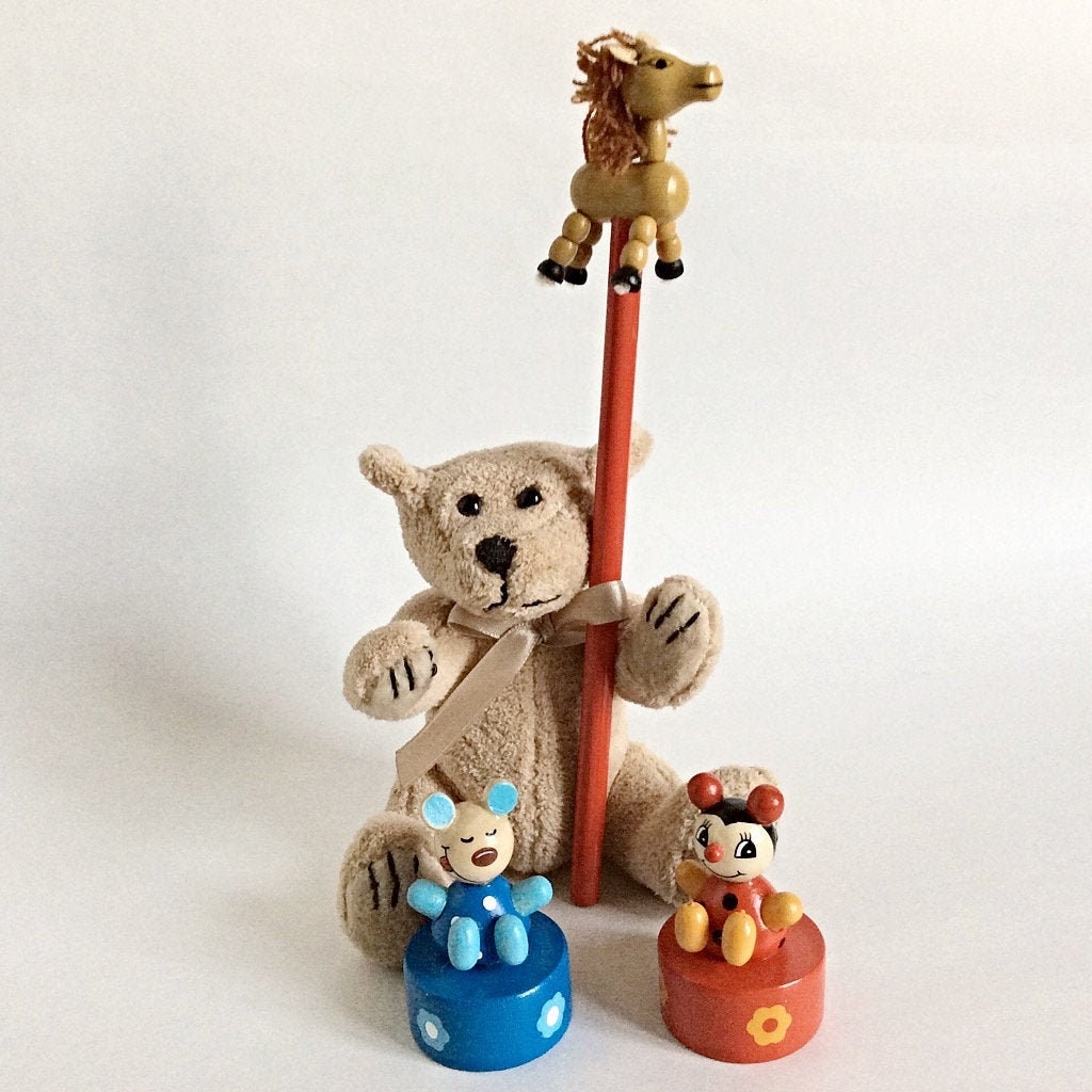 Deux tailles crayons bois, ours et coccinelle et un crayon à papier Cheval bois. État neuf, très jolies finitions