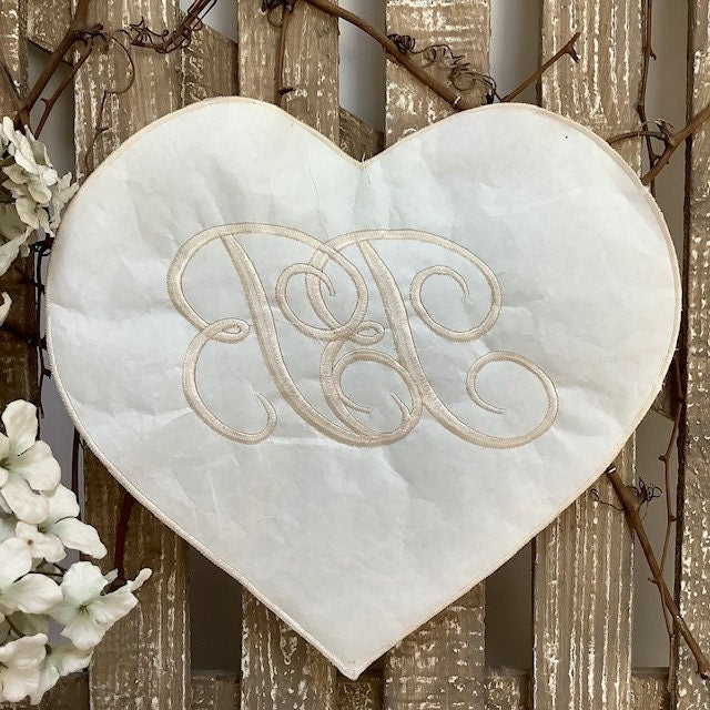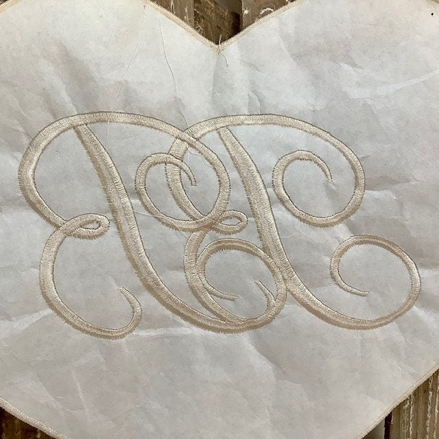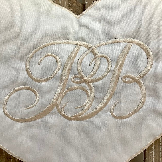 Grand écusson à coudre vintage motif coeur ton blanc et initiales BB brodées ton beige.