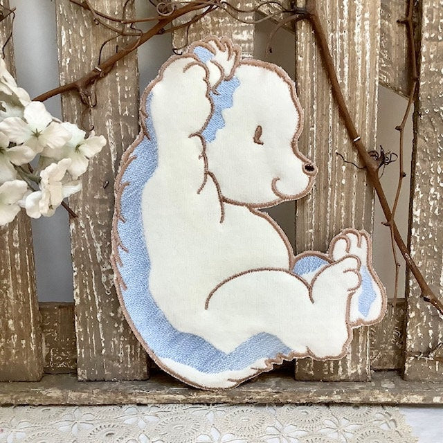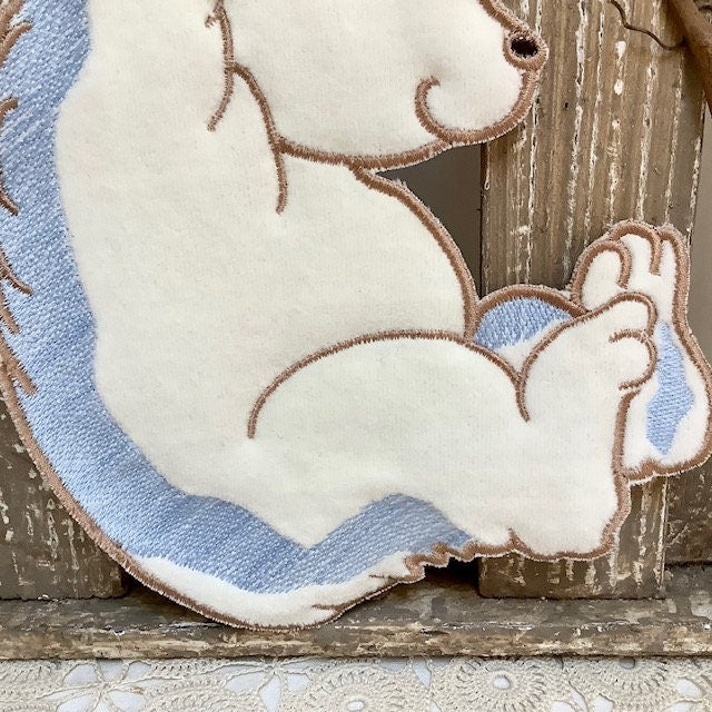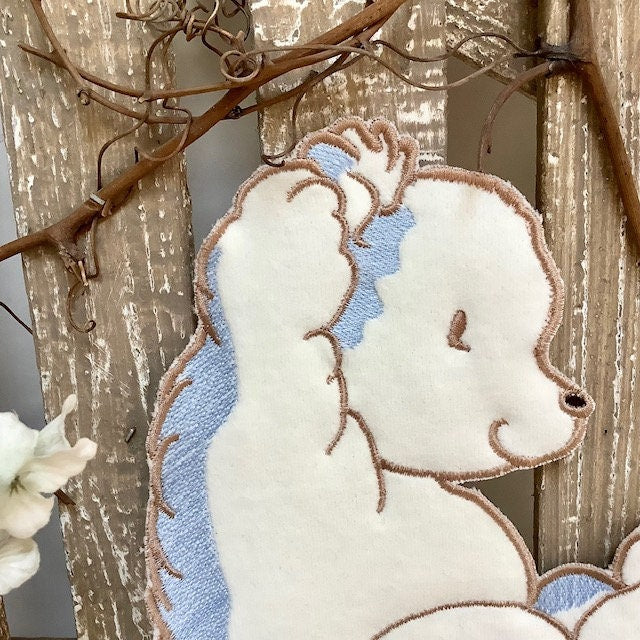 Un grand écusson à coudre vintage motif hérisson ton bleu et blanc. Aspect polaire, molletonné