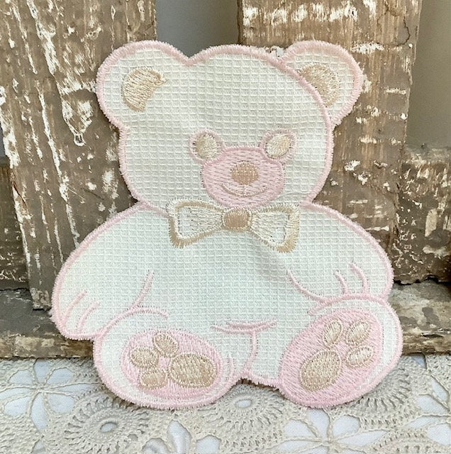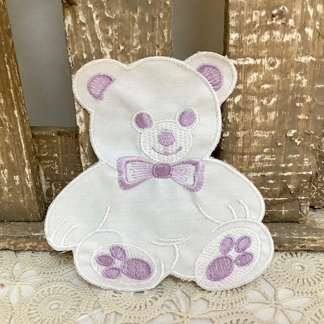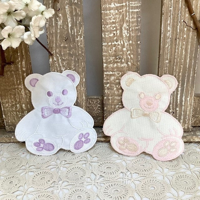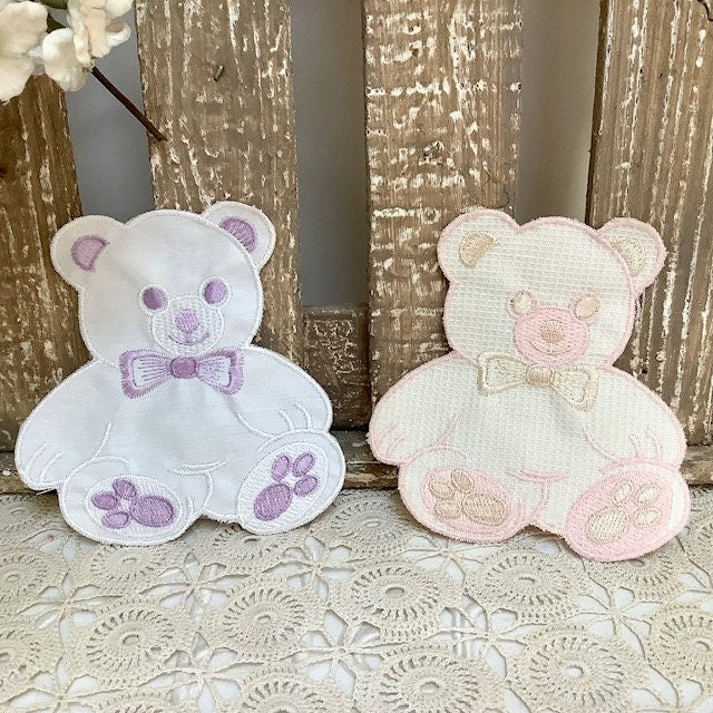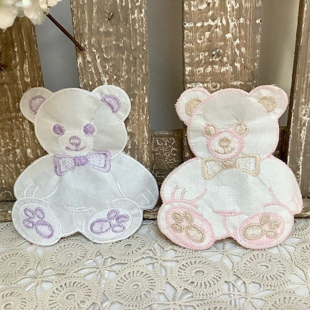 Deux écussons à coudre vintage motifs oursons tons mauve et rose. Aspect satiné pour le mauve et nid d’abeille pour le rose.