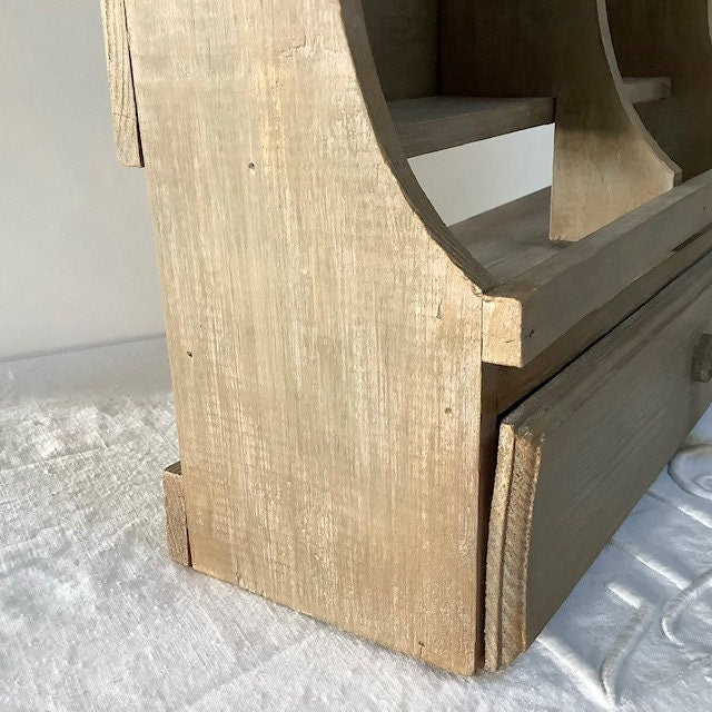 Étagère bois ou organisateur de bureau avec petit tiroir. Repeinte et patinée ton brun, quelques touches dorées. Finition vernis mat. Livrée sans fixations.