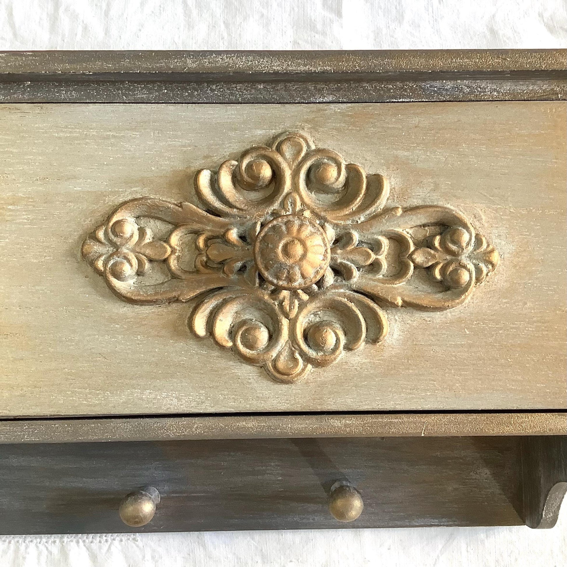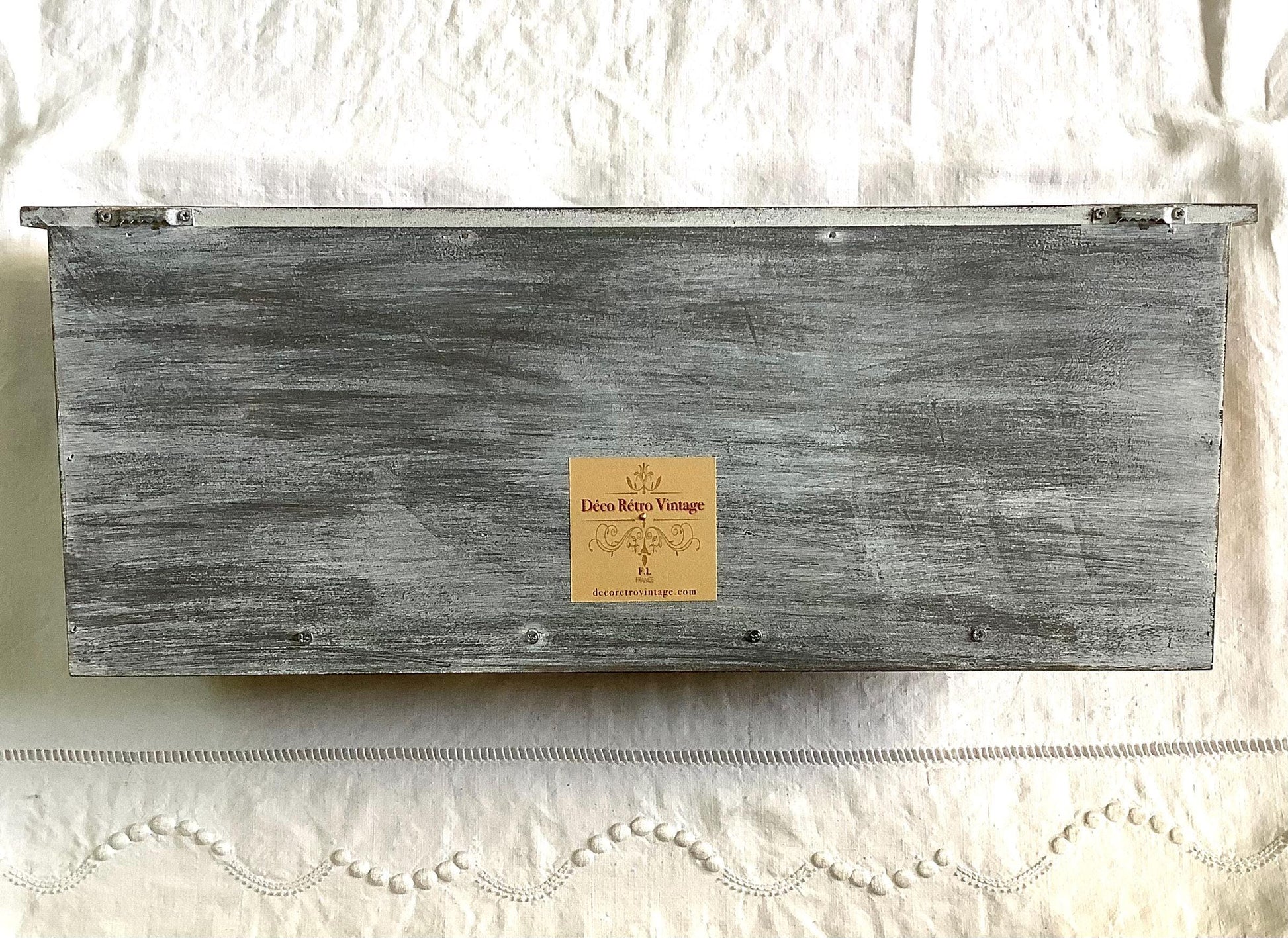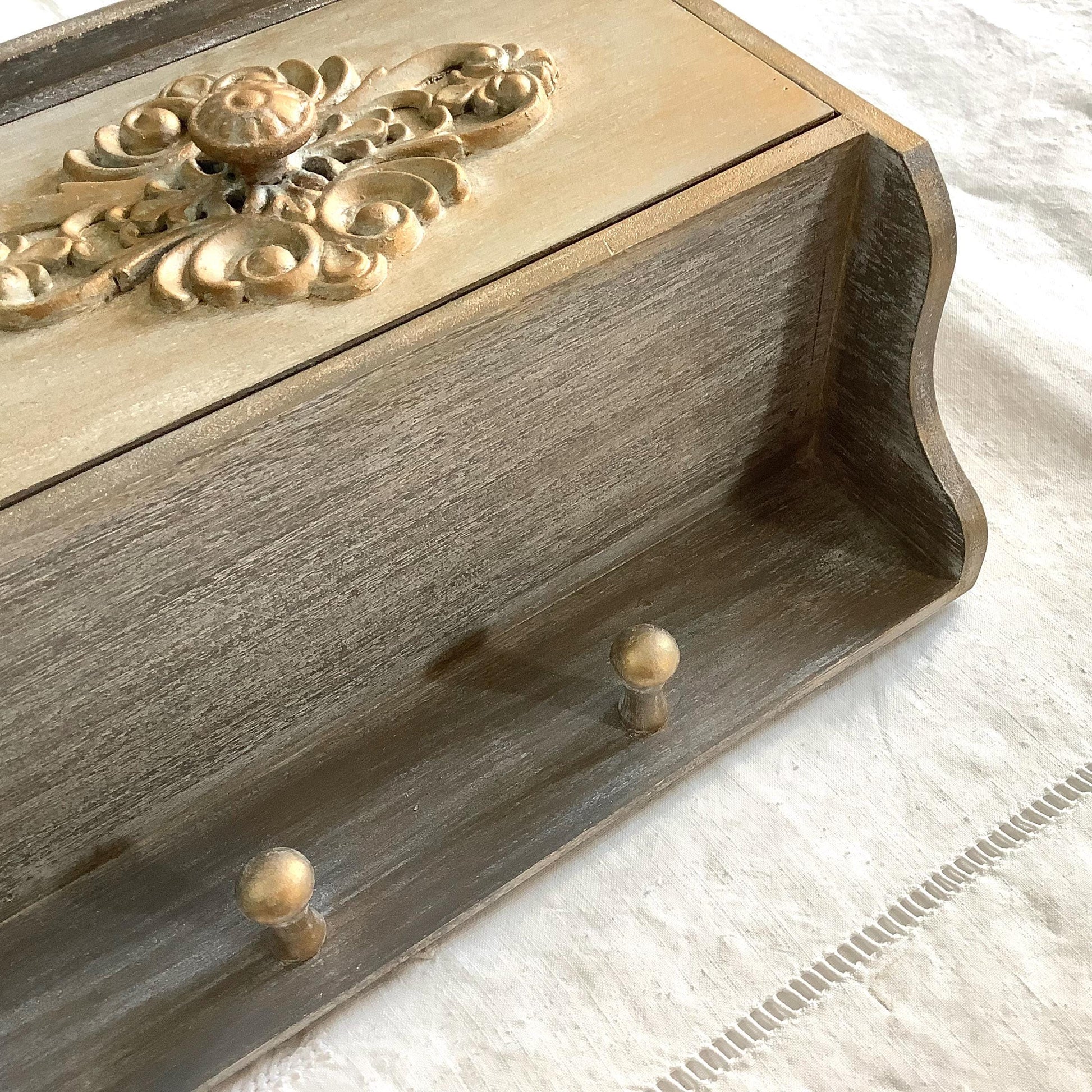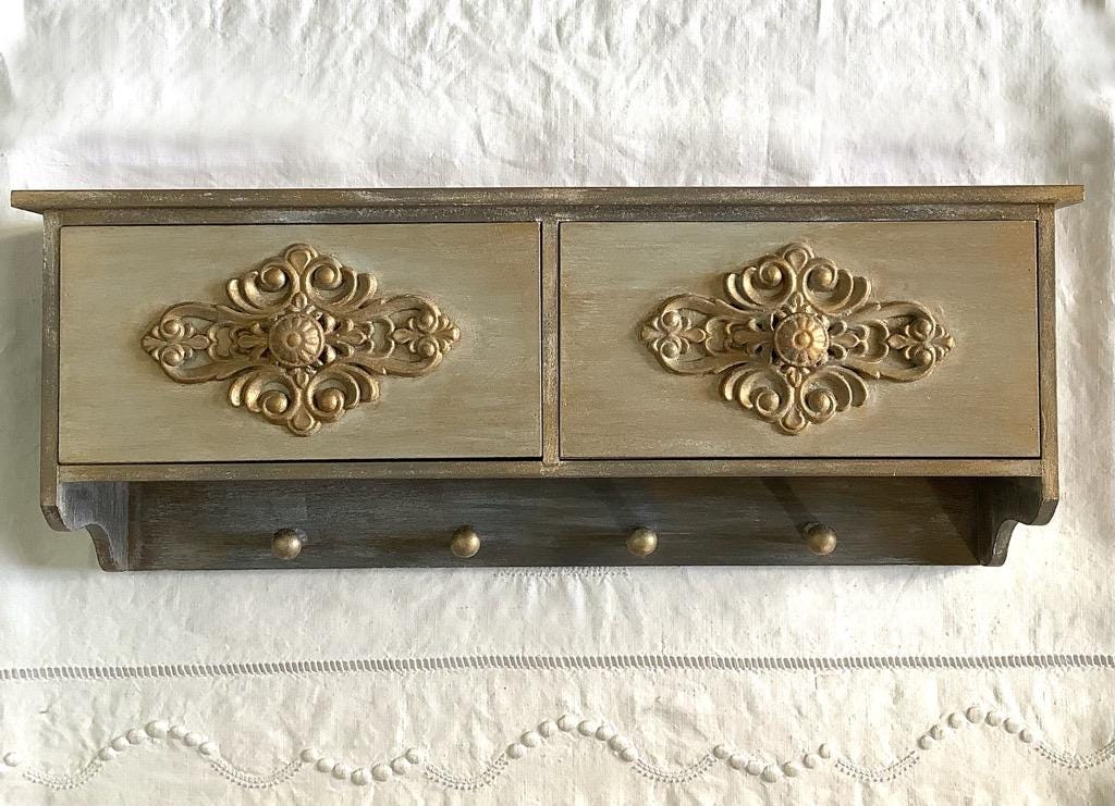 Étagère murale en bois vintage comprenant 2 tiroirs et 4 crochets pour torchons… Ton gris et blanc patiné doré. Finition vernis Deux fixations au dos