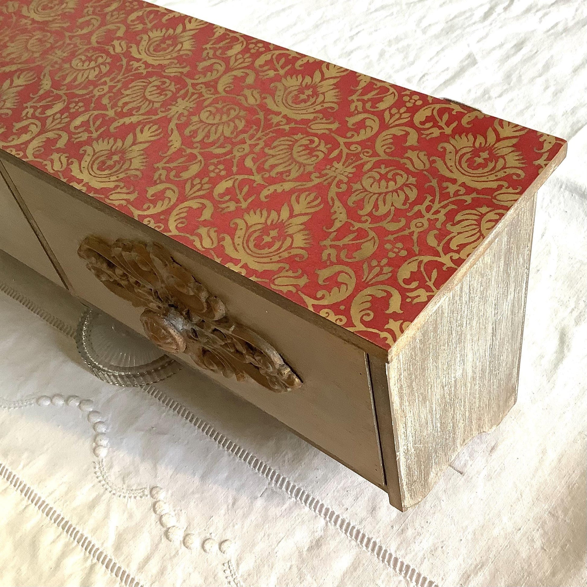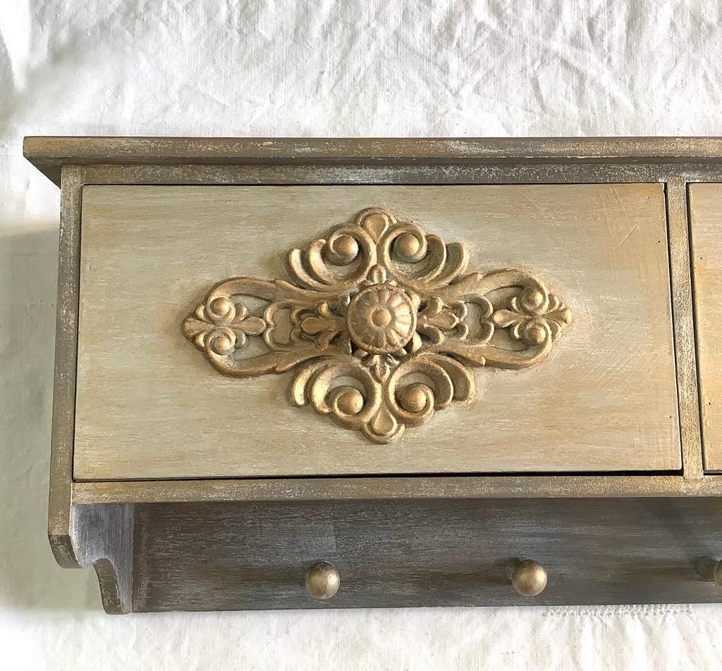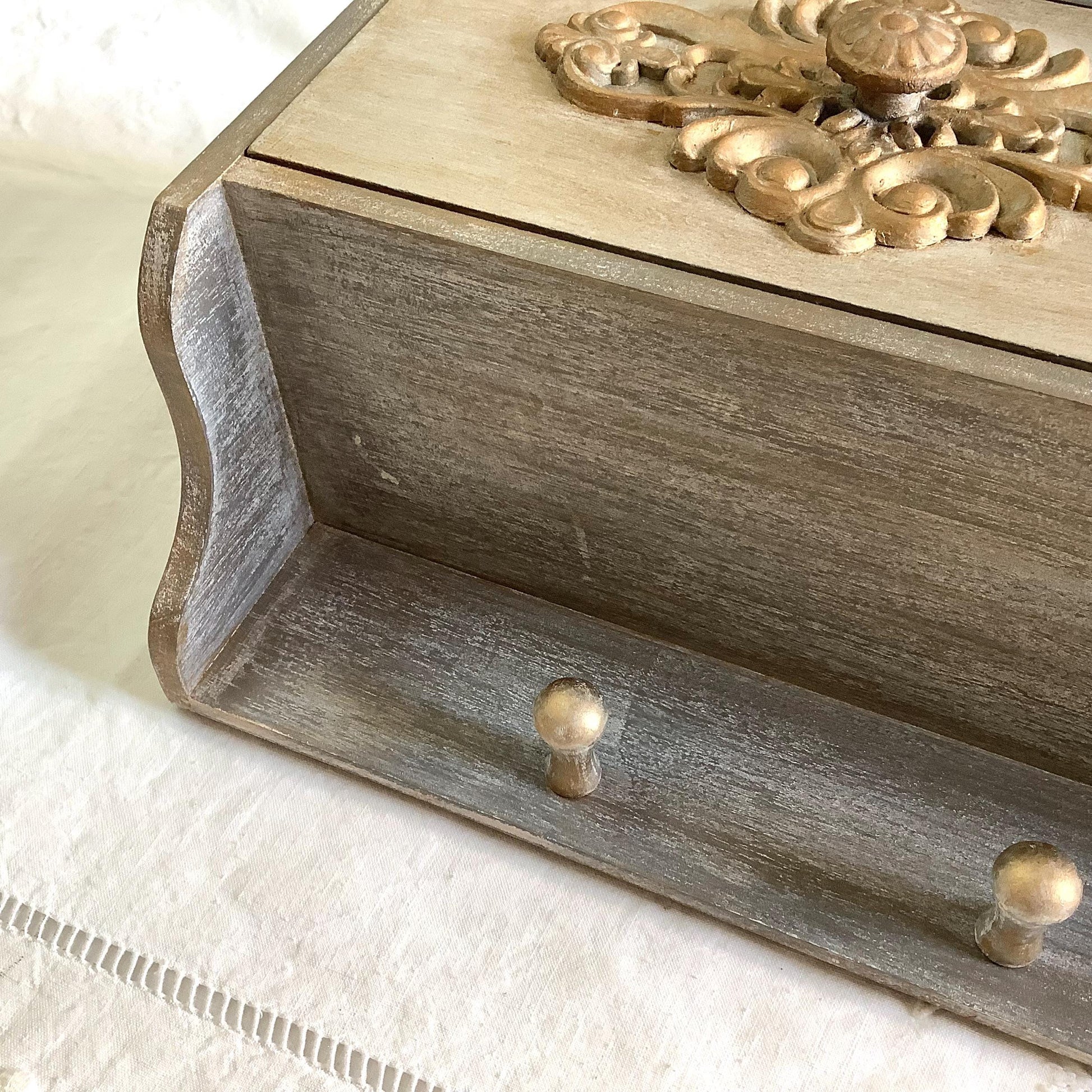 Étagère murale en bois vintage comprenant 2 tiroirs et 4 crochets pour torchons… Ton gris et blanc patiné doré. Finition vernis Deux fixations au dos