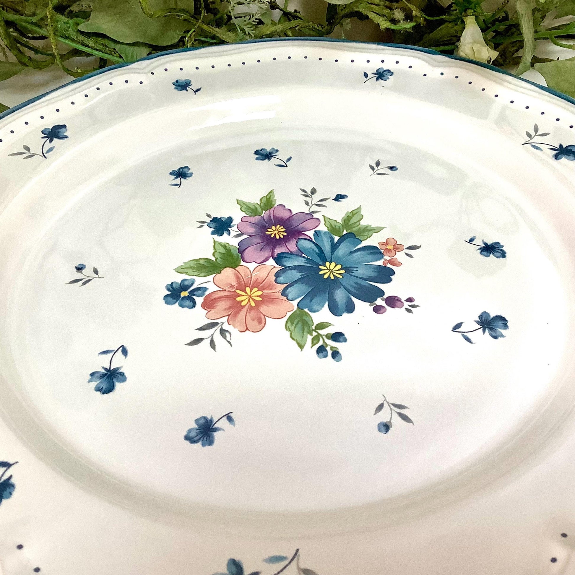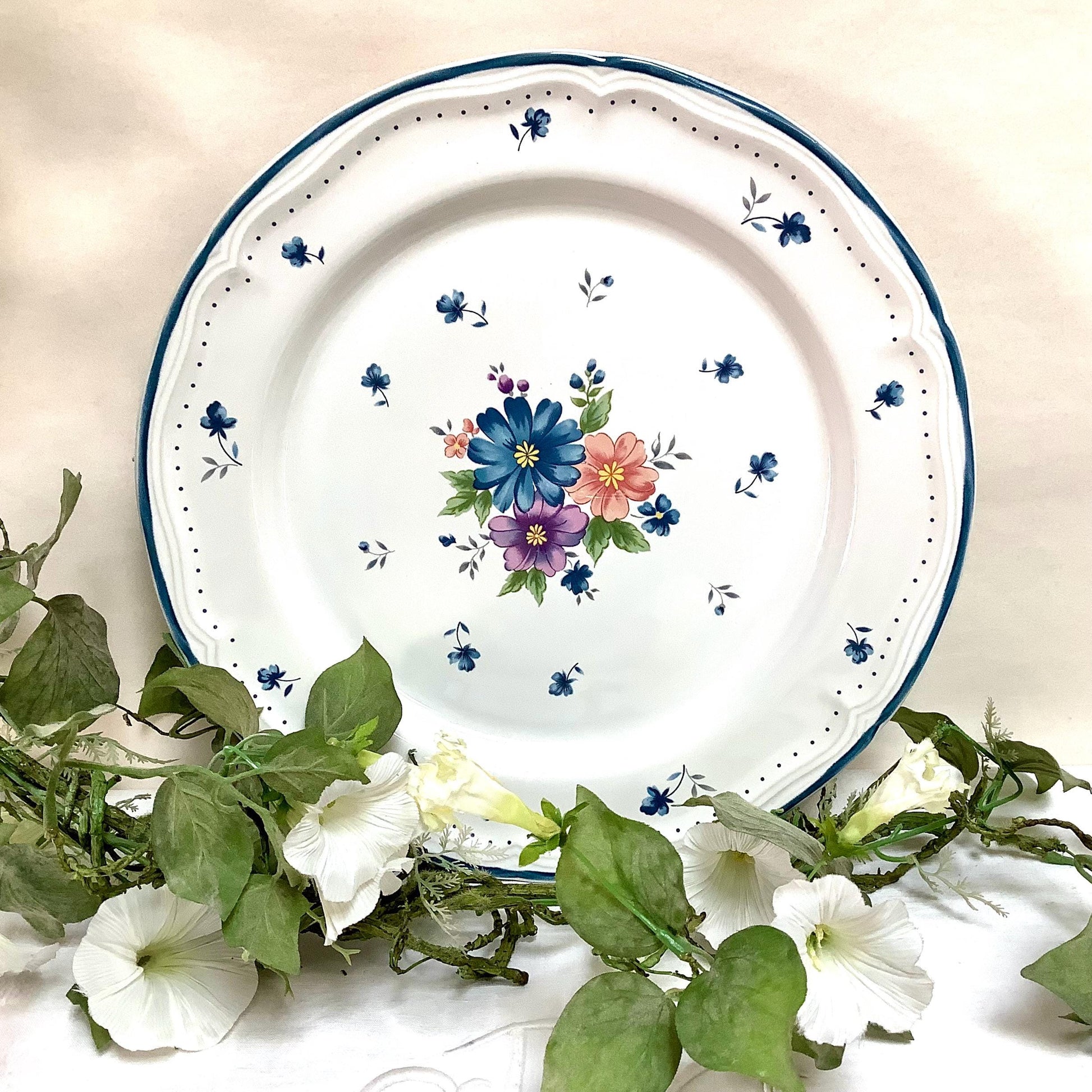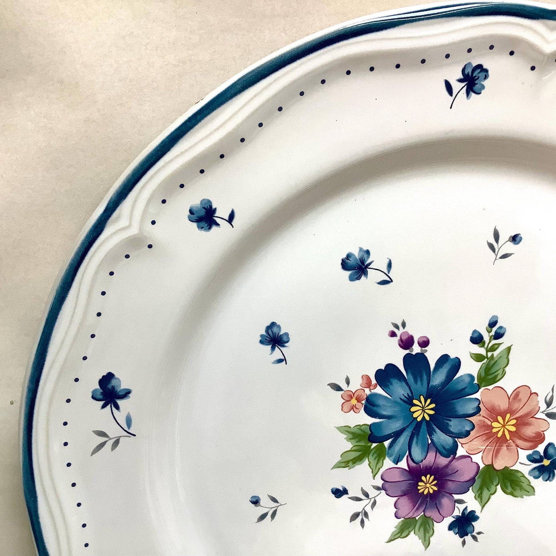 Grand plat de service vintage en grès émaillé très résistant provincial bouquet. Période années 1980. Motifs floraux. Très bon état, légères traces et rayures d’usage. (voir photos) Passe au four, micro-onde, congélateur et lave-vaisselle.