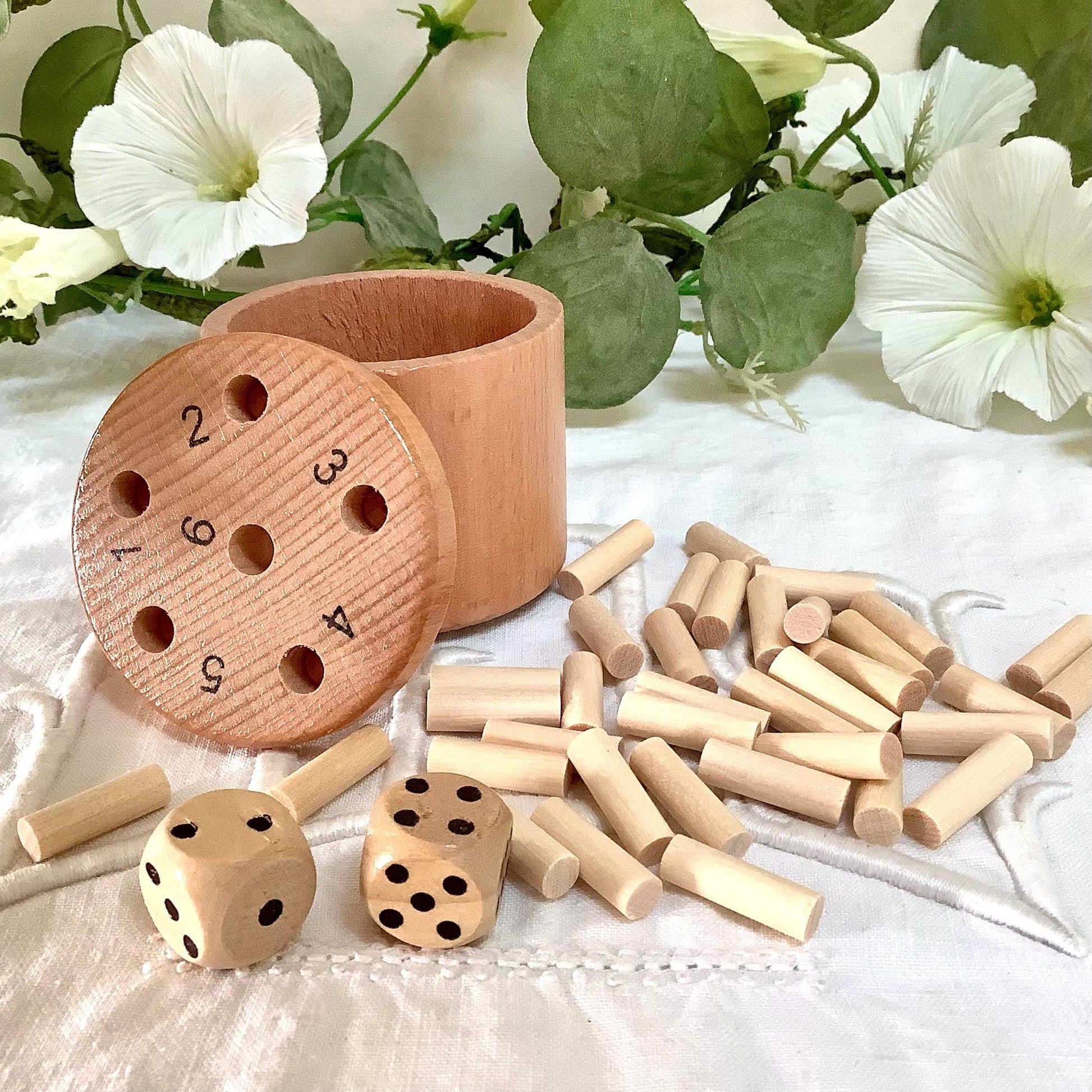 Hauteur env. 5,5 cm - Ø env. 6 cm - 36 baguettes en bois - 2 dés - 1 boîte avec couvercle