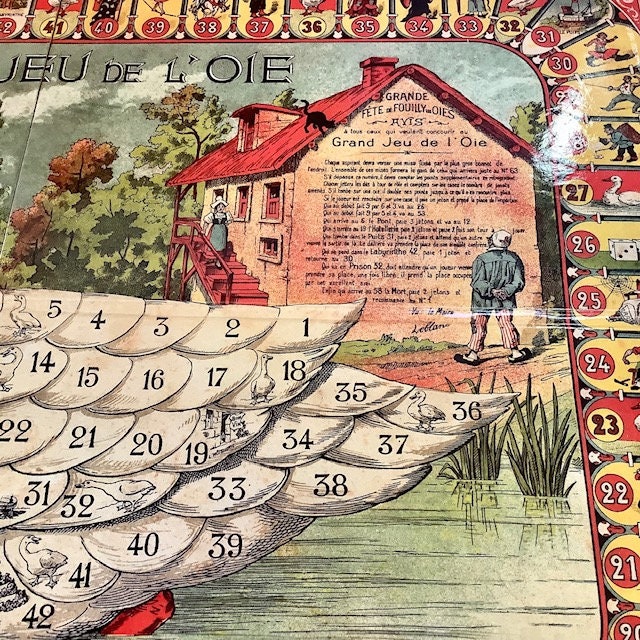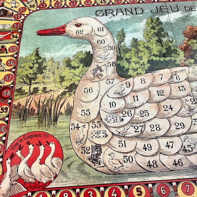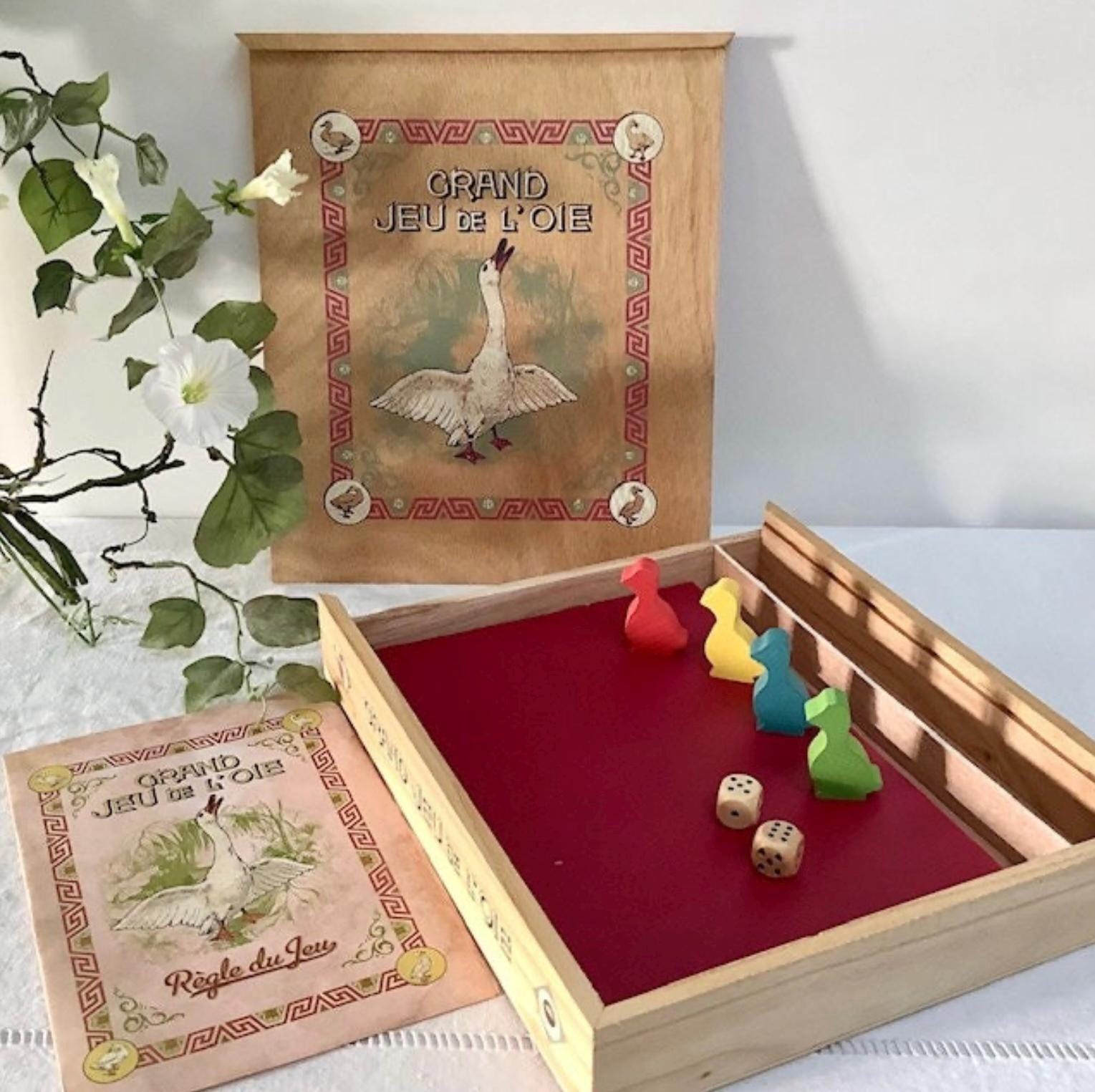 Grand jeu de l’oie, un jeu traditionnel de style vintage dans un coffret en bois. Complet, de très jolies illustrations. Contient un plateau de jeu, 4 pions oie, 1 dé et une règle du jeu. Très bon état comme neuf, légères traces d’usages sous le plateau.