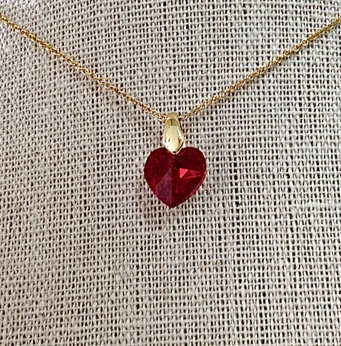Pendentif cœur en cristal de Swarovski couleur Light siam avec chaîne de 40 cm en acier inoxydable couleur or à maillons ovales fins.