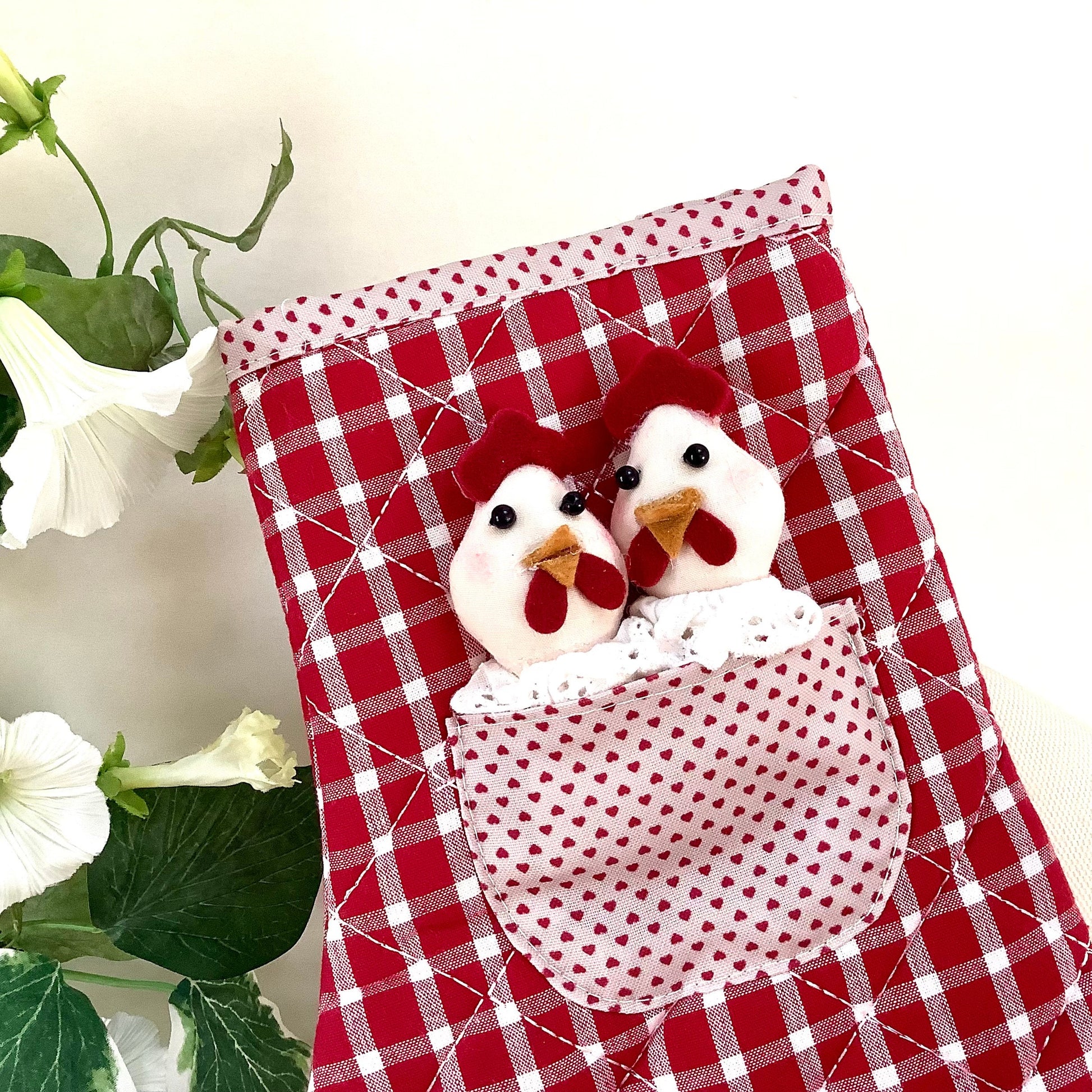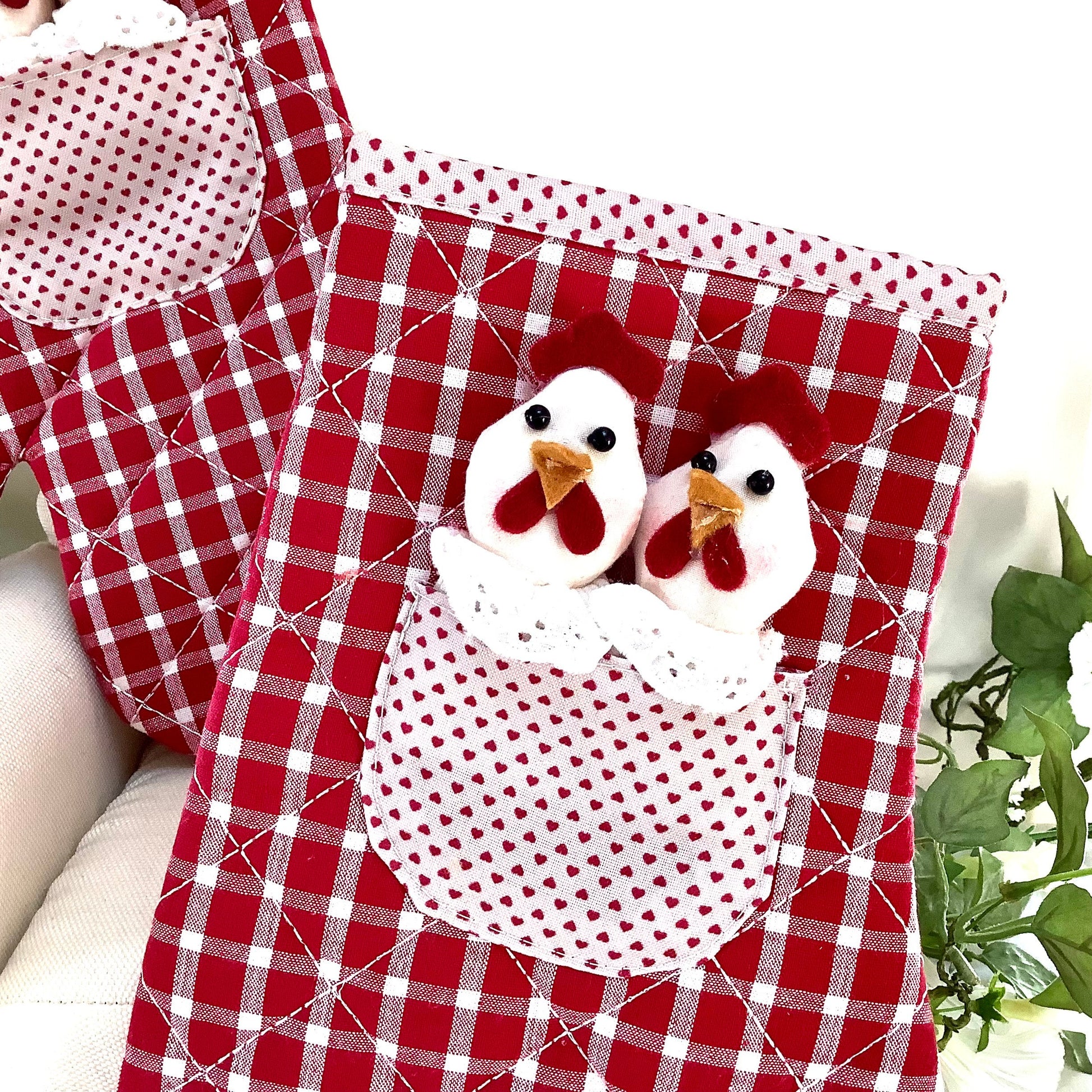 Deux maniques ou gants de four de style vintage avec poules. Tissu, dentelles, de jolies finitions.