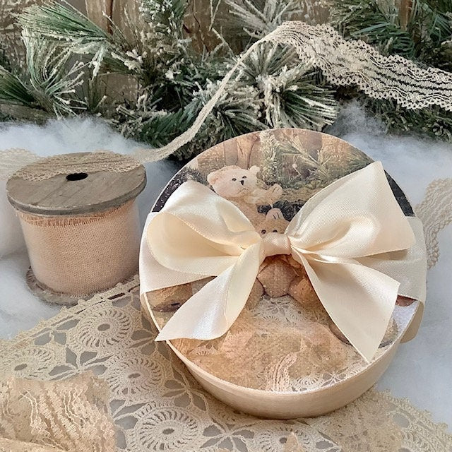 Boîte: diamètre 13 cm - hauteur 6 cm - Ours: hauteur 10 cm - Largeur 9 cm env.