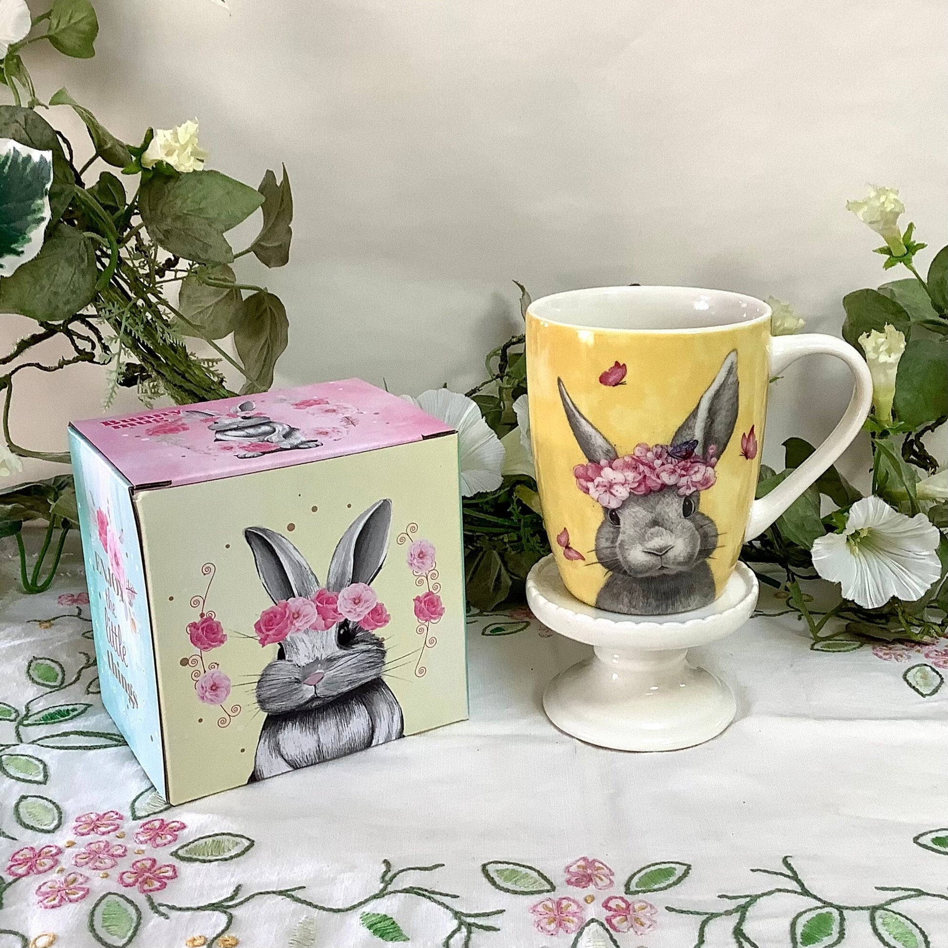 Un mug en porcelaine, fond jaune avec motifs lapin. Jolies finitions, livré avec boîte cadeau.
