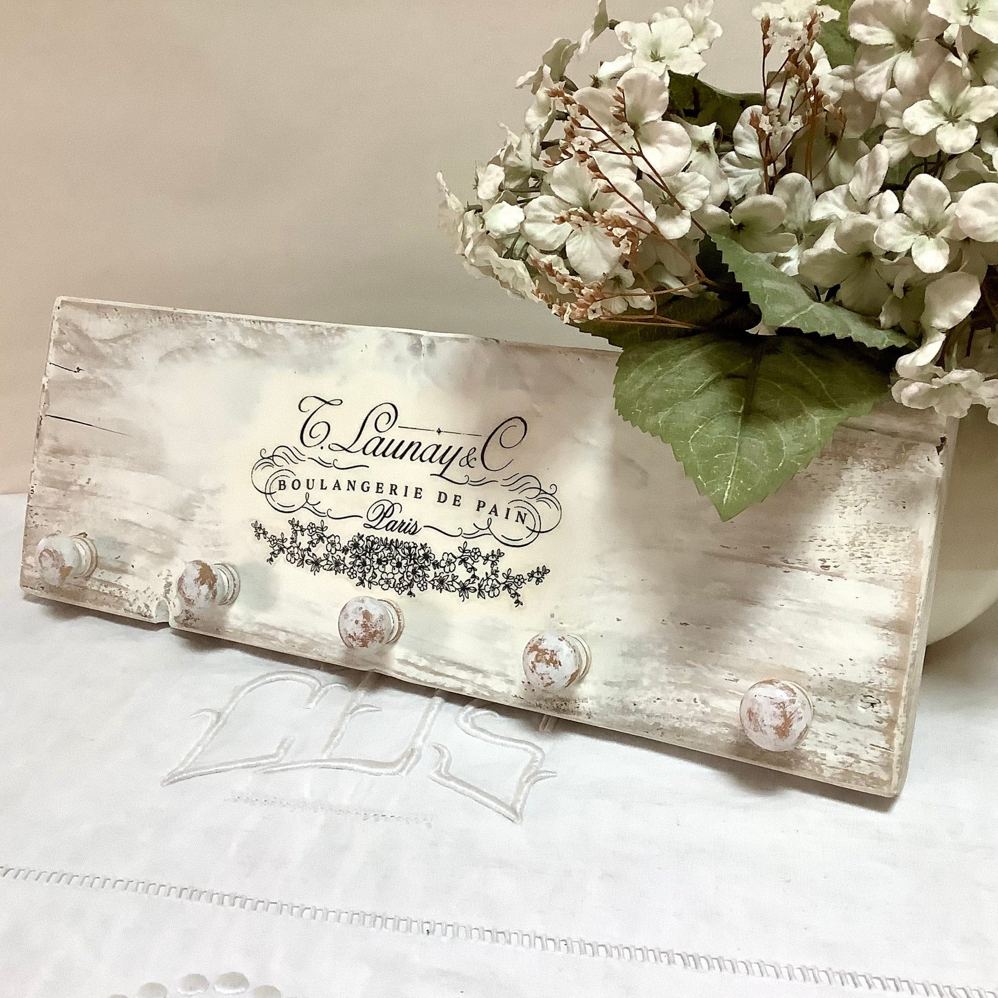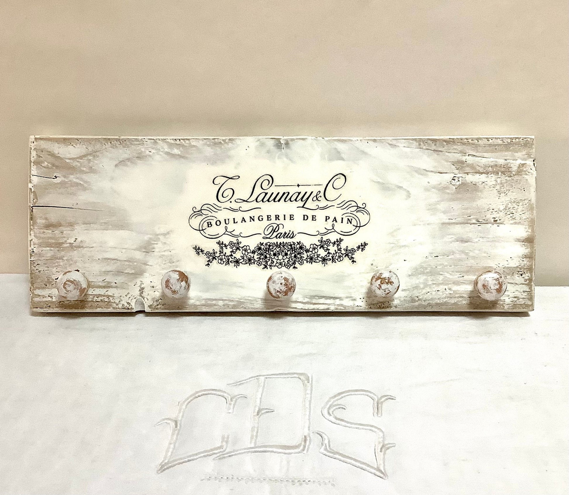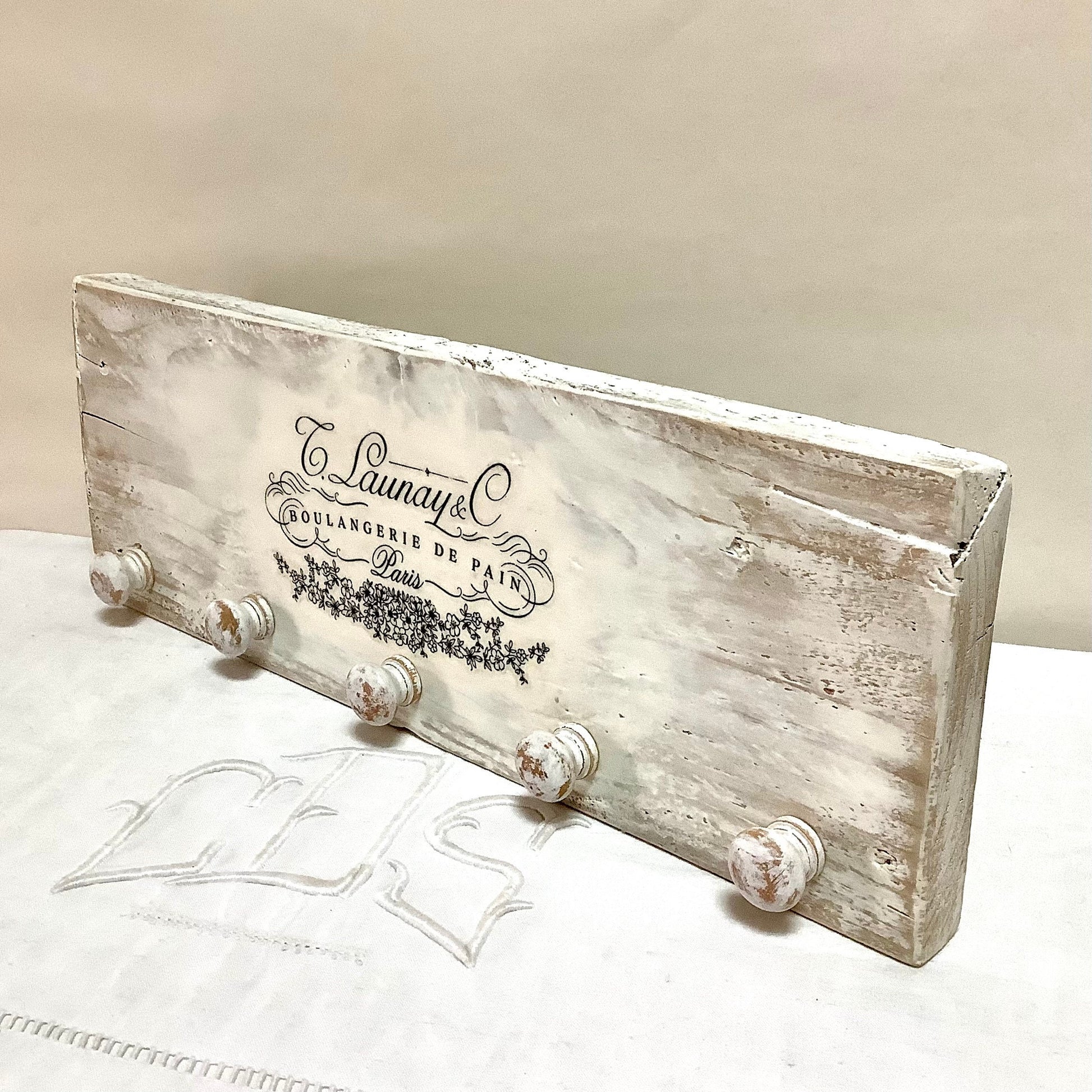 Patère ou accroche torchons avec cinq accroches, thème Boulangerie de pain. En bois, (sapin massif) peint et patiné blanc. Finition vernis, résistant aux taches . Deux crochets au dos. État neuf, réalisation DecoRetroVintage. A noter finitions artisanales, rustiques, campagne décoration… (voir photos)