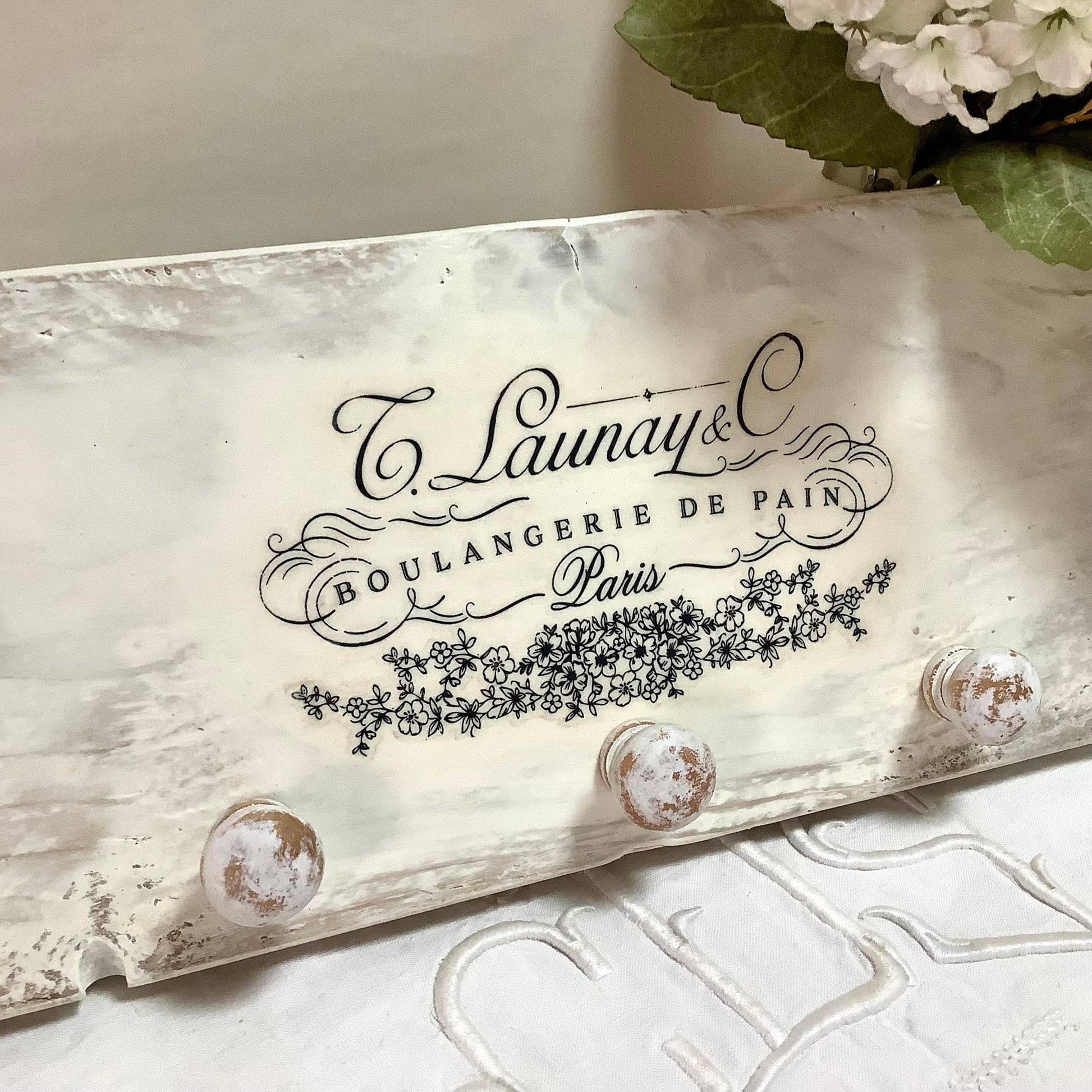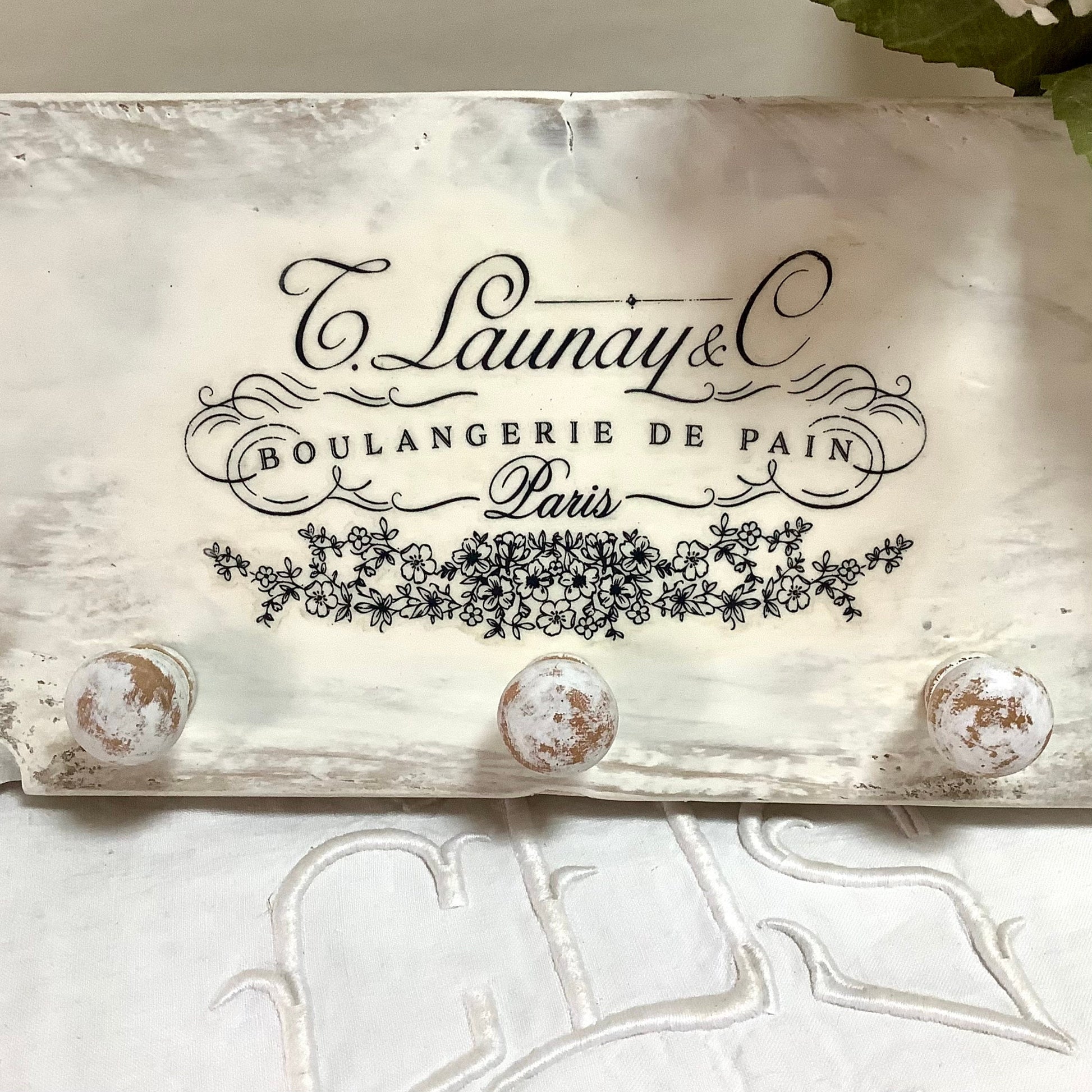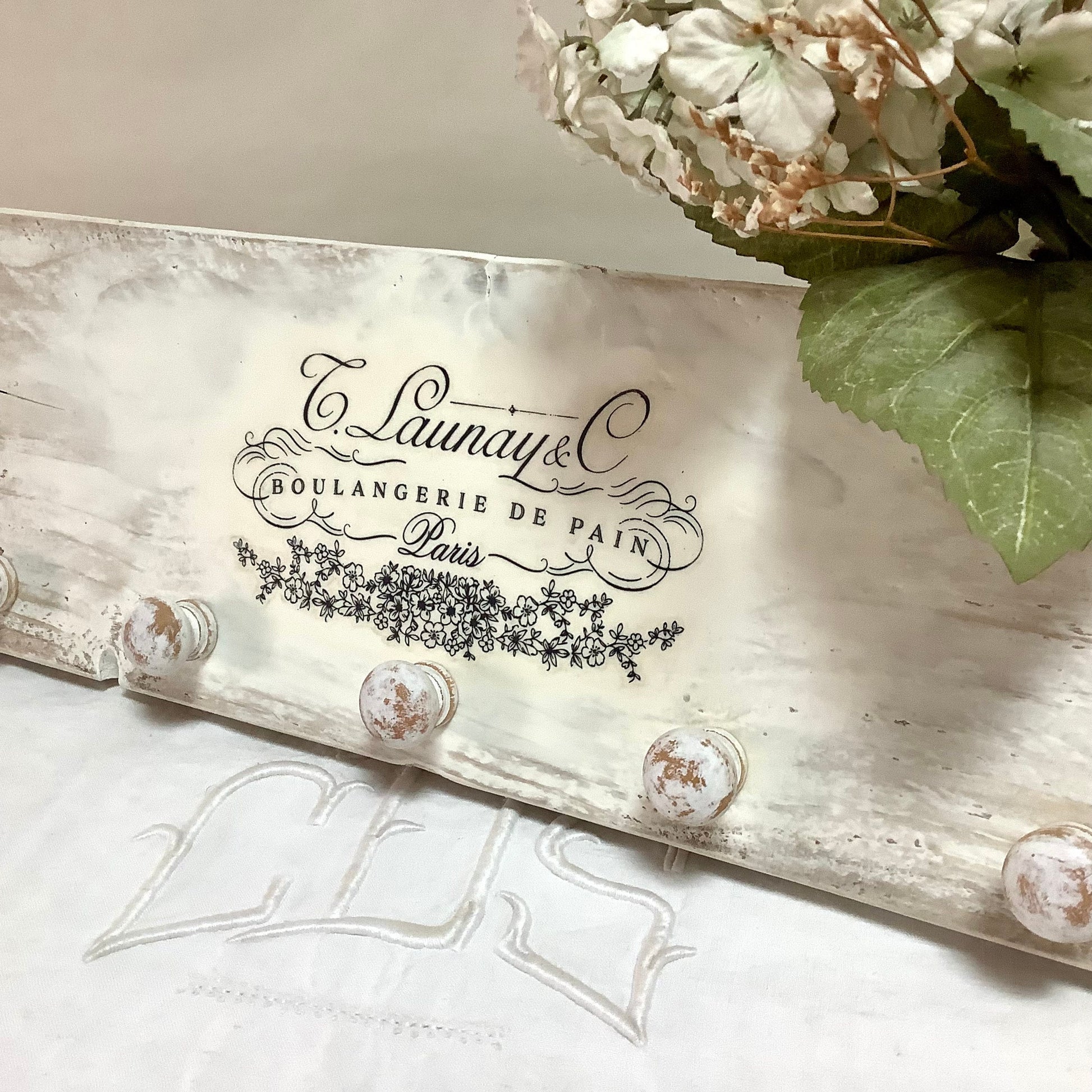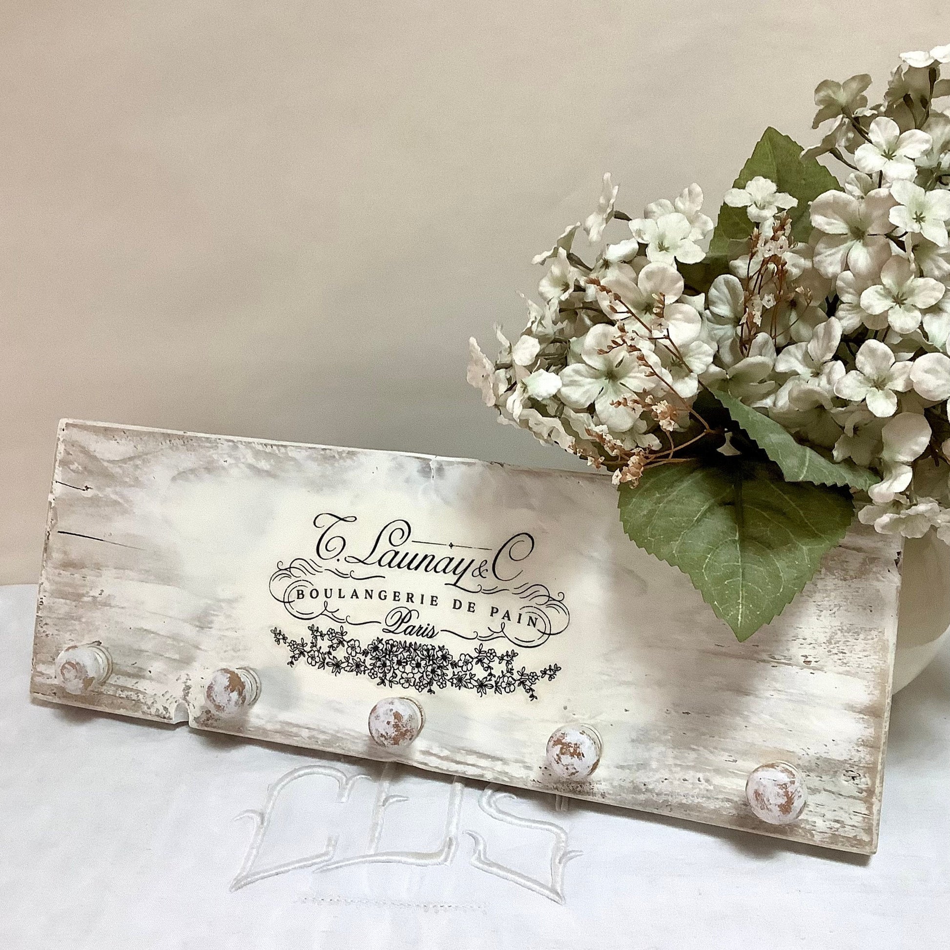 Patère ou accroche torchons avec cinq accroches, thème Boulangerie de pain. En bois, (sapin massif) peint et patiné blanc. Finition vernis, résistant aux taches . Deux crochets au dos. État neuf, réalisation DecoRetroVintage. A noter finitions artisanales, rustiques, campagne décoration… (voir photos)