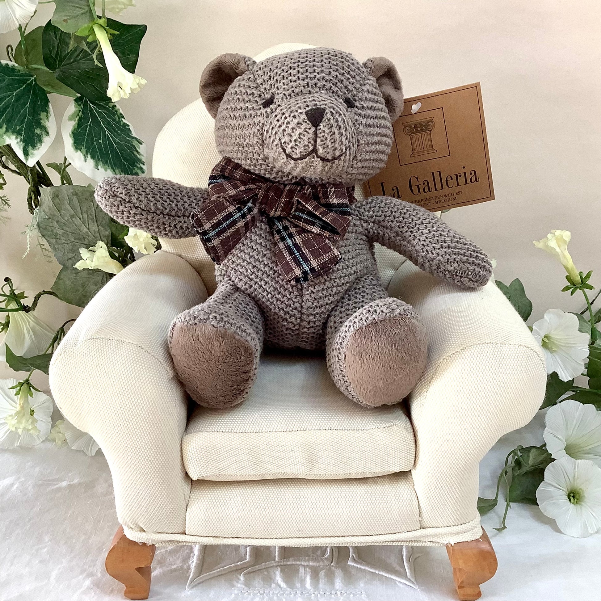 Ours en peluche et tricot gris avec ruban la galleria, position assise .