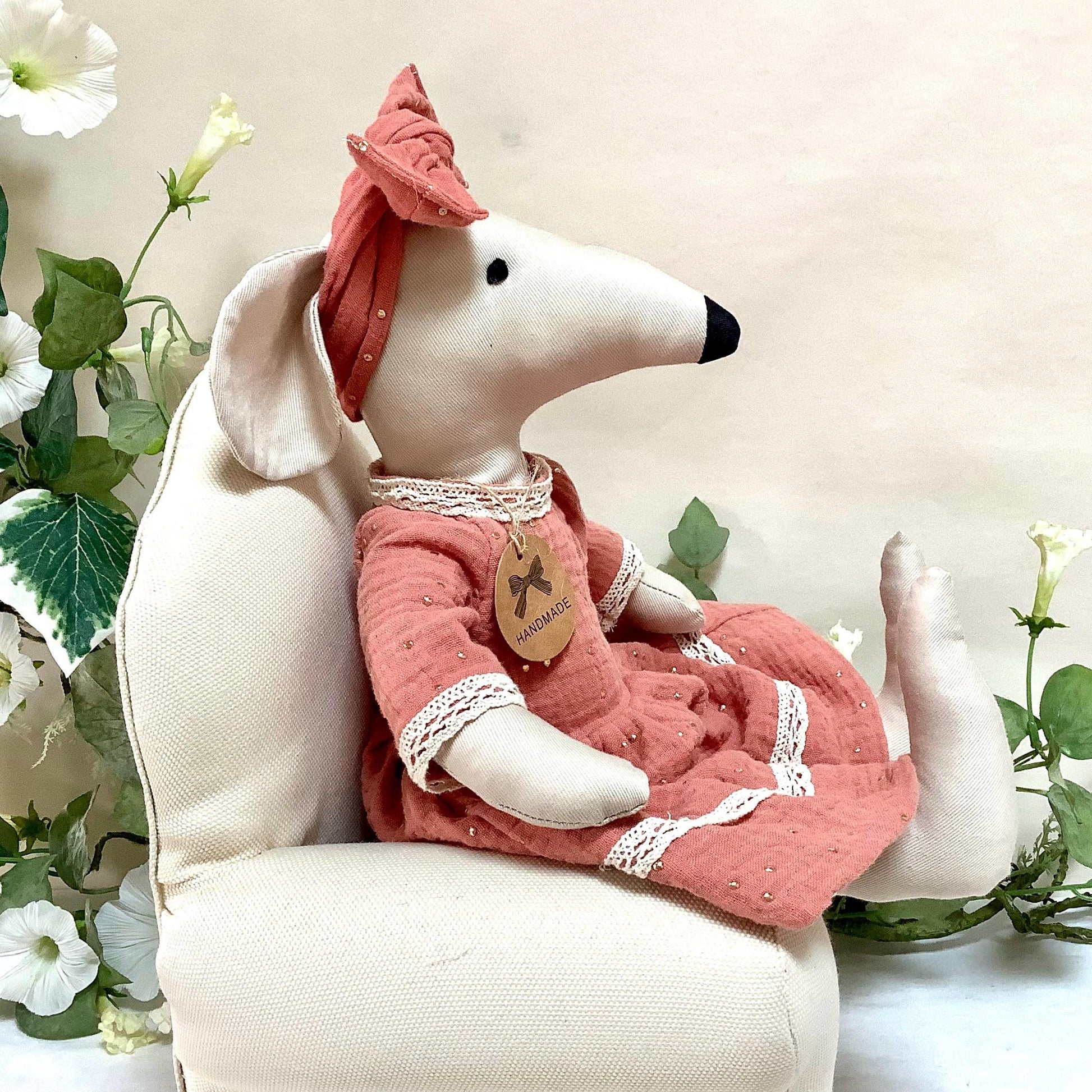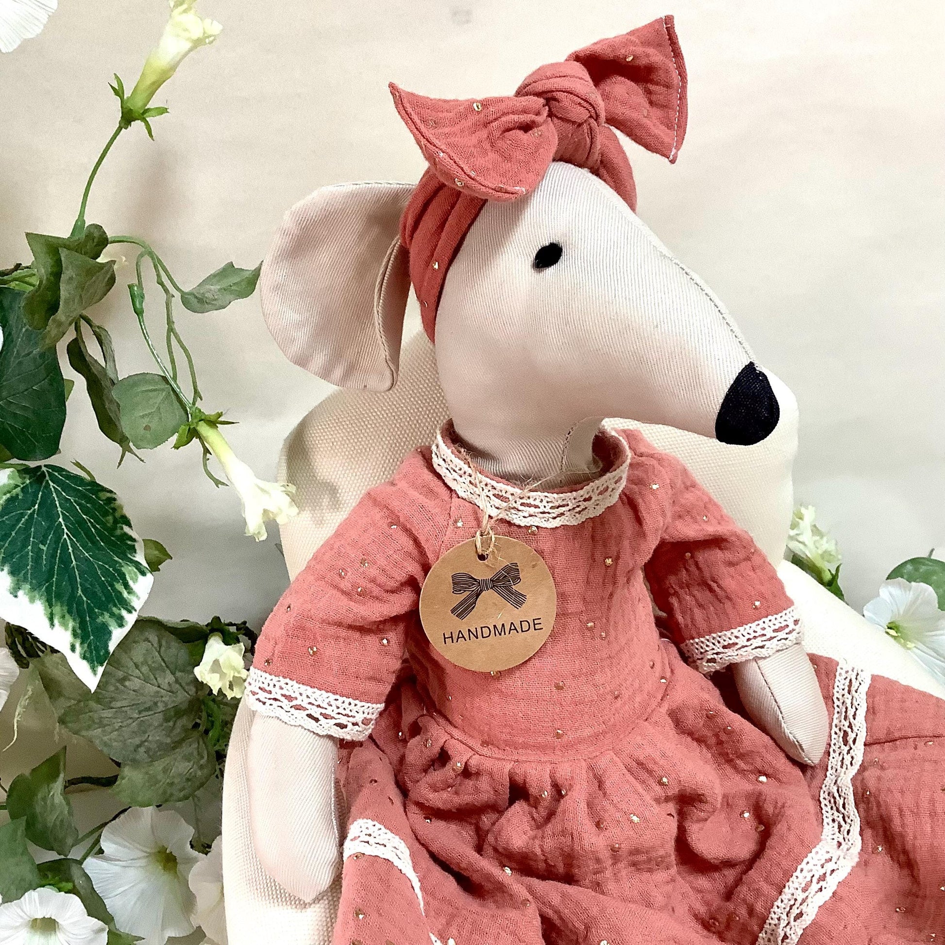 Adorable peluche vintage souris en tissu. Robe rouge avec dentelles et points dorés. Robe et ruban peuvent être ôtés. État neuf avec étiquette Jolies finitions Livré avec sac cadeau kraft, papier de soie Hauteur: 38 cm - Largeur 19 cm env. - prof. 12 cm env.