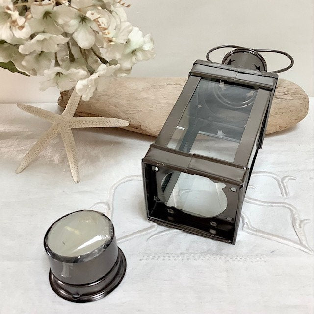 Petite lanterne marine carrée en métal avec crochet de suspension. Vitres verre, la bougie s’insère par le socle.(voir photos) Livrée avec une bougie.Très jolies finitions