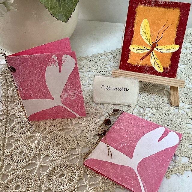 Trois petites cartes doubles en papier artisanal type mûrier. Une carte thème libellule + 2 cartes couleur rose