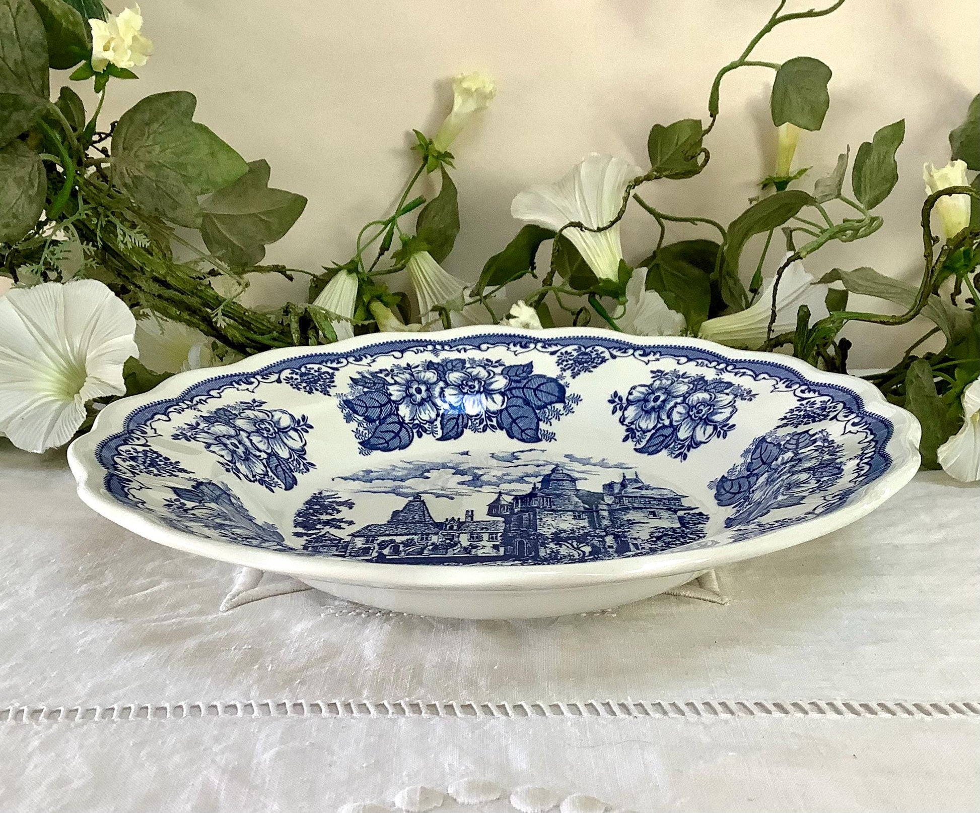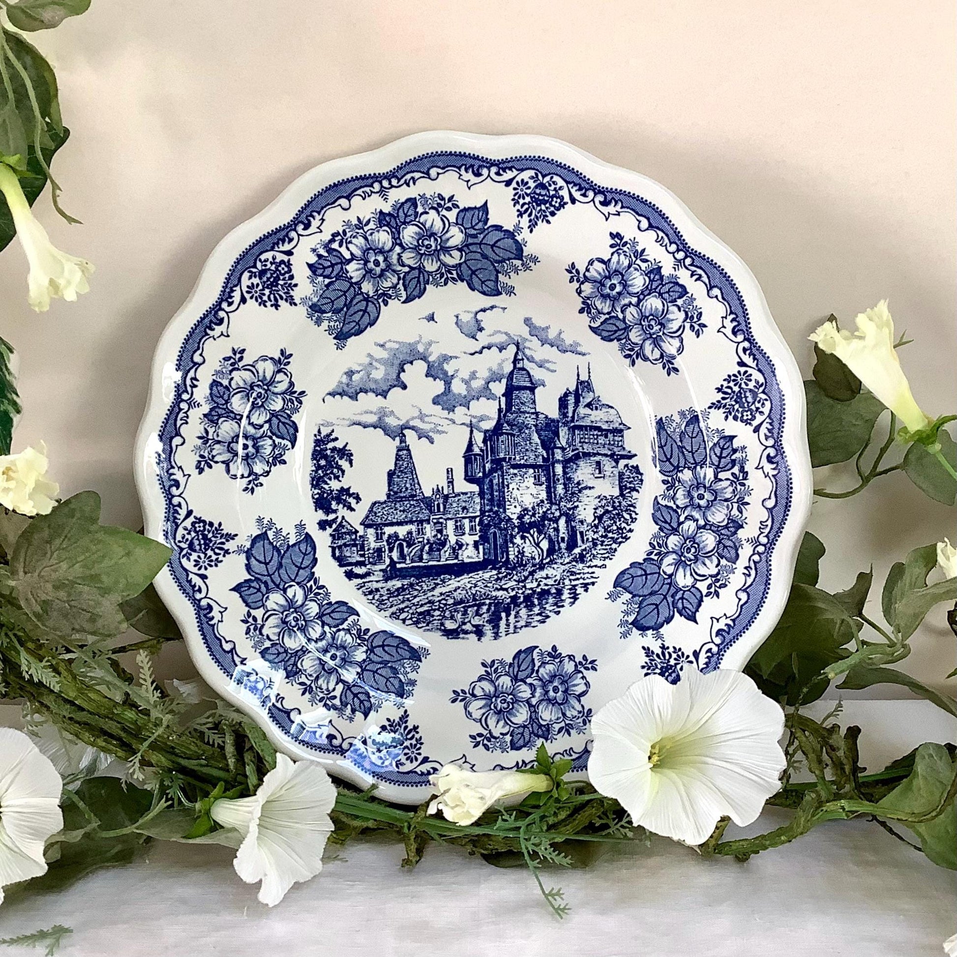 Plat creux bleu décor anglais à bord chantourné en faïence forte rf English landscape. Très bon état, pas de fêle ni d’éclats