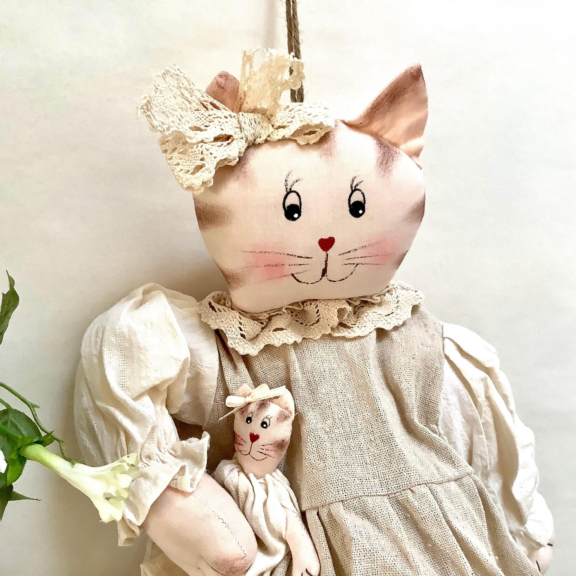 Porte sacs chat en tissu, style vintage avec deux chatons, robe en lin et dentelles. Jolies finitions.