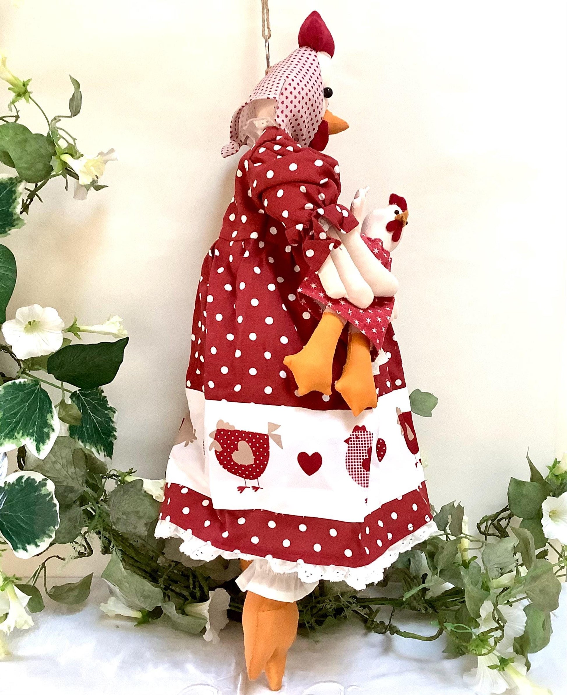 Porte sacs poule robe rouge blanc avec deux poussin la galleria ht 55 cm