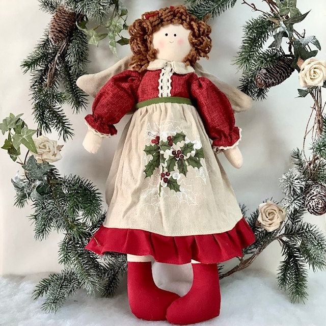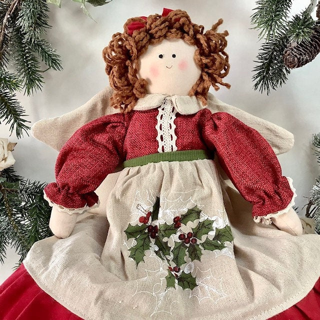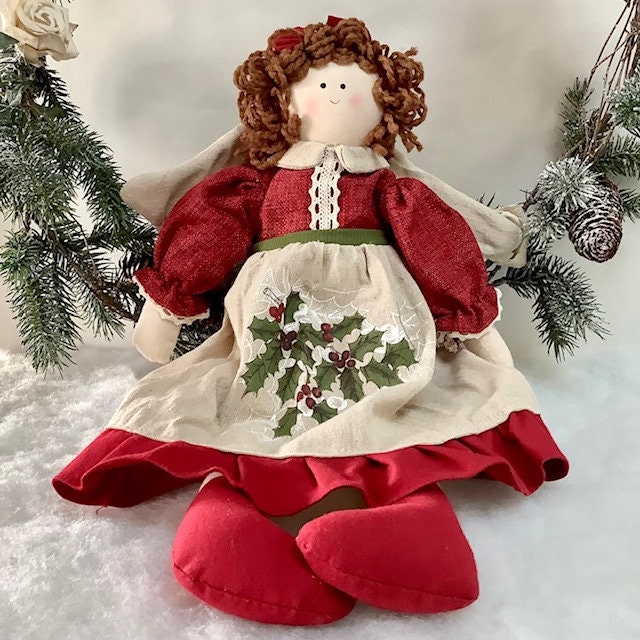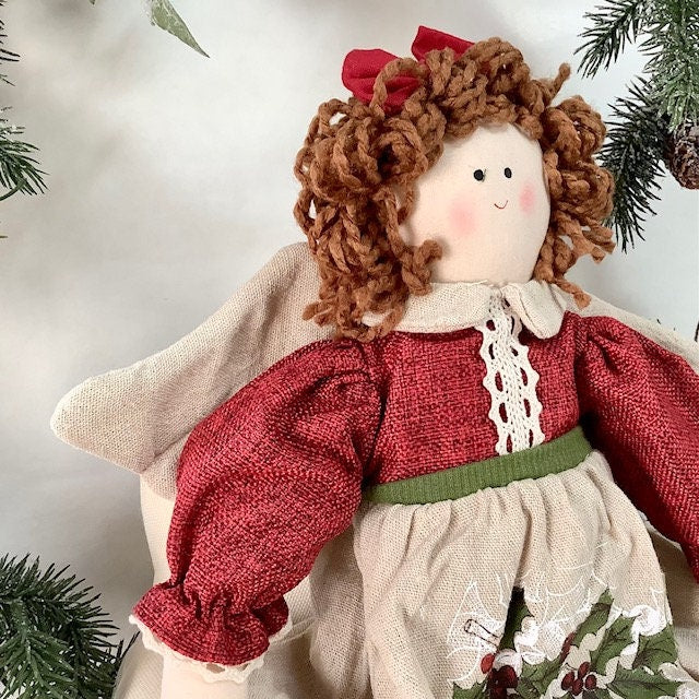 Poupée de chiffon ange tissu écru rouge ht 27 cm vintage
