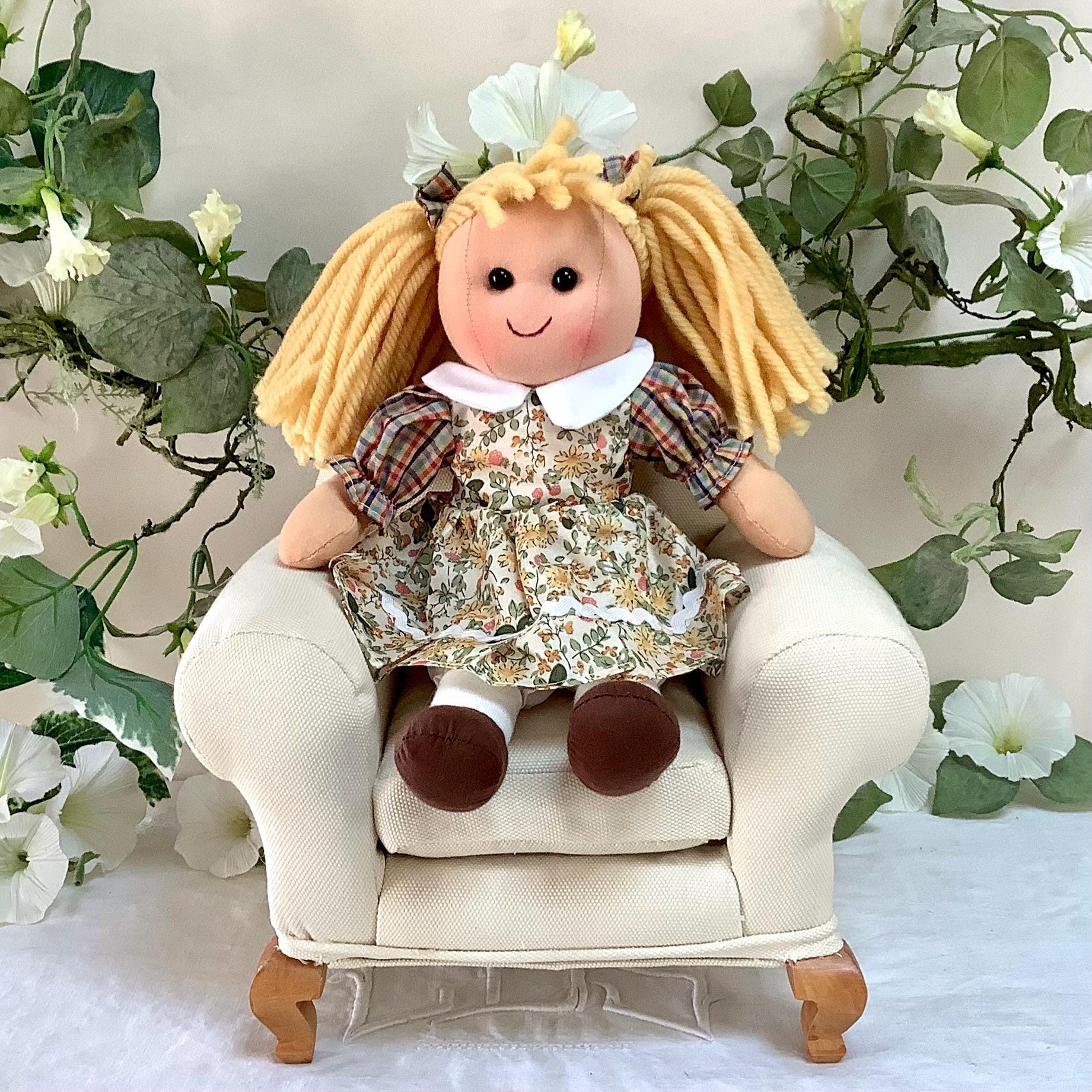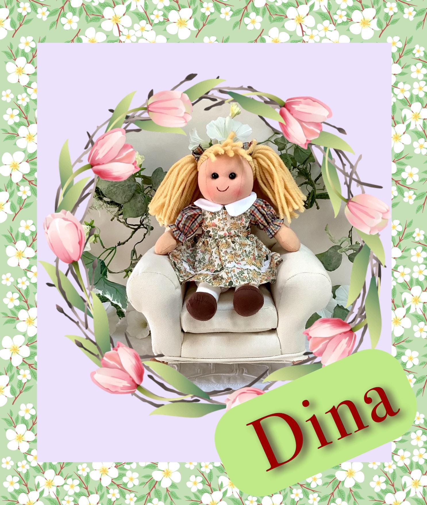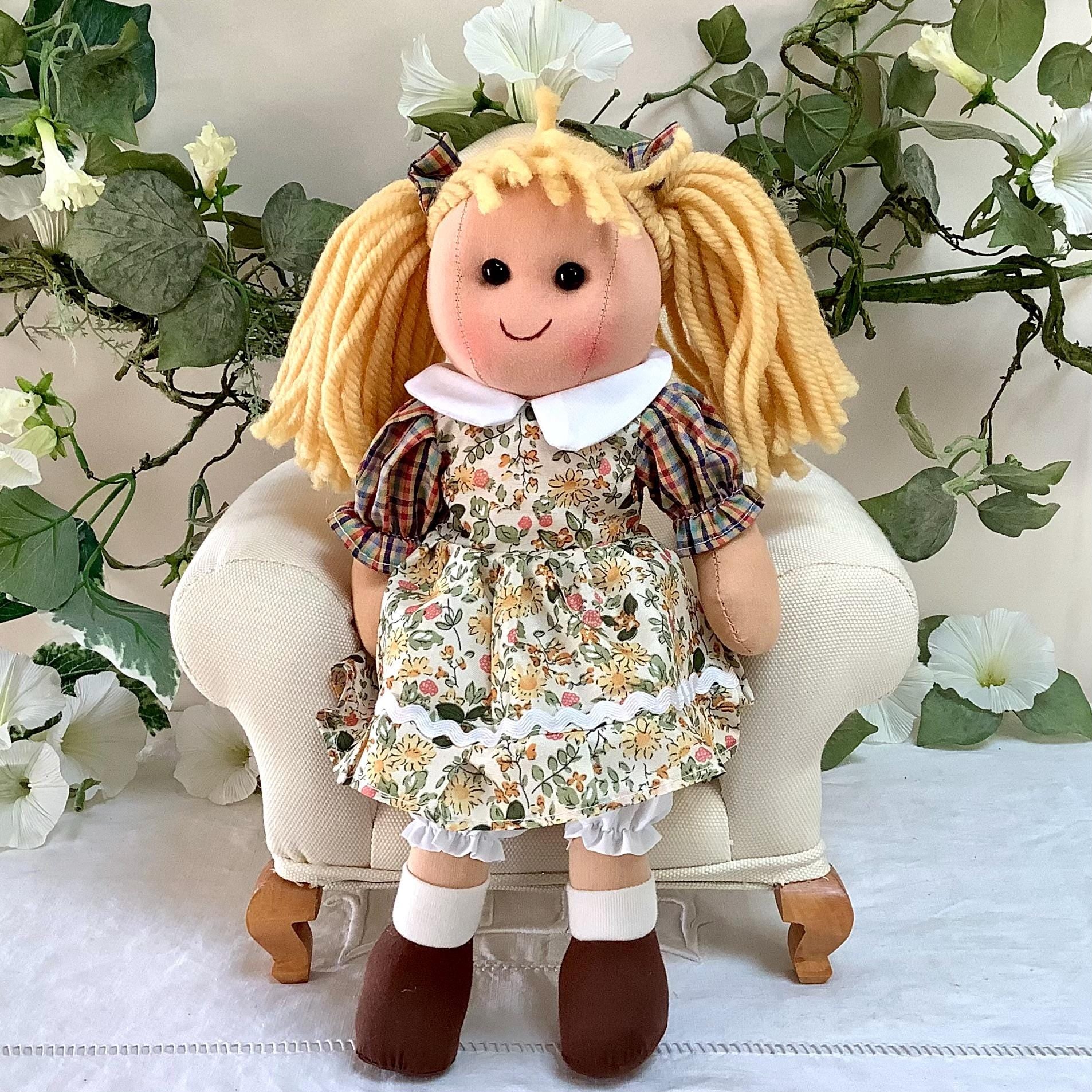 Poupée de chiffon en tissu modèle Dina. Les vêtement peuvent se retirer à l’exception des chaussons. Robe beige motifs fleuris, jolies finitions - 8 modèles différents - Normes CE