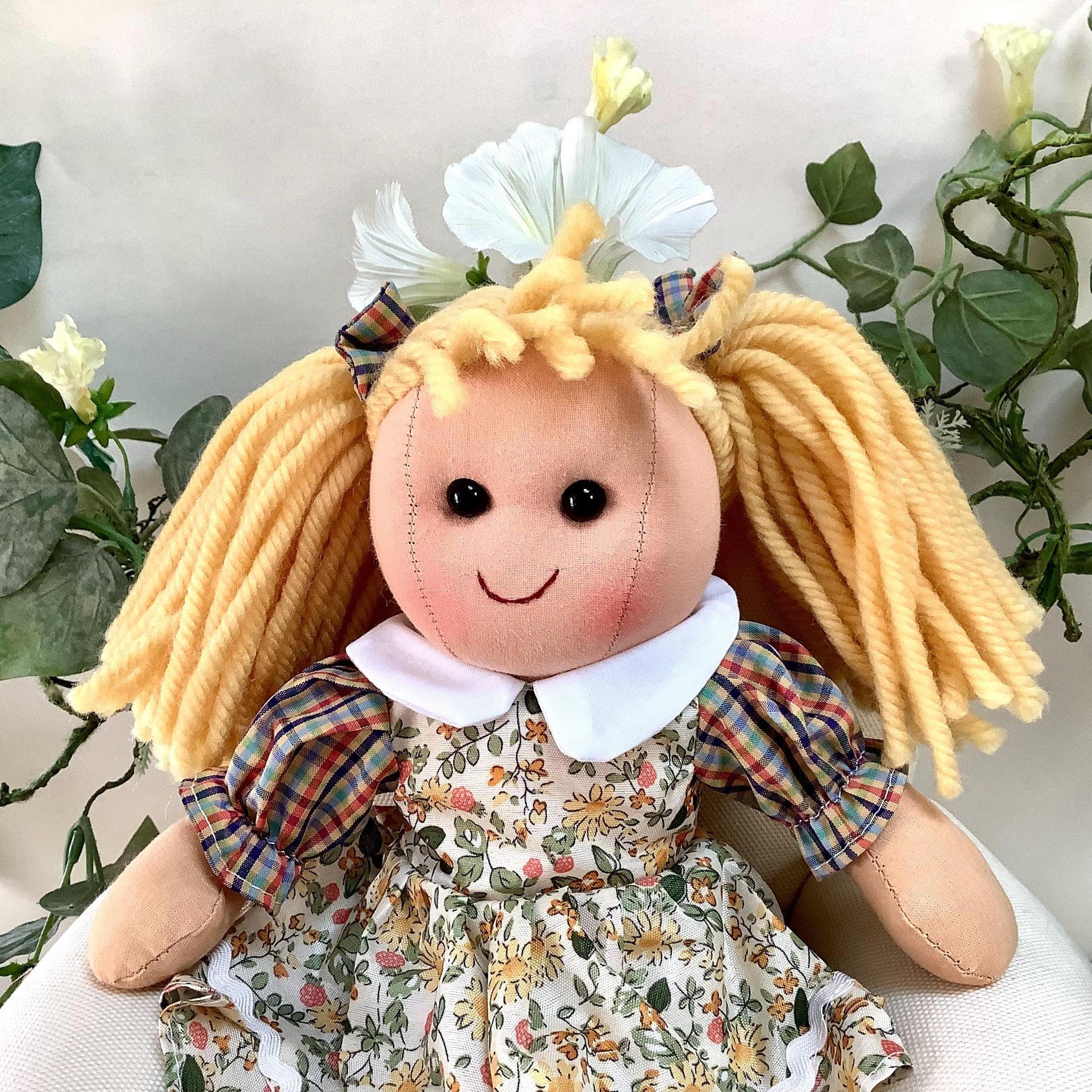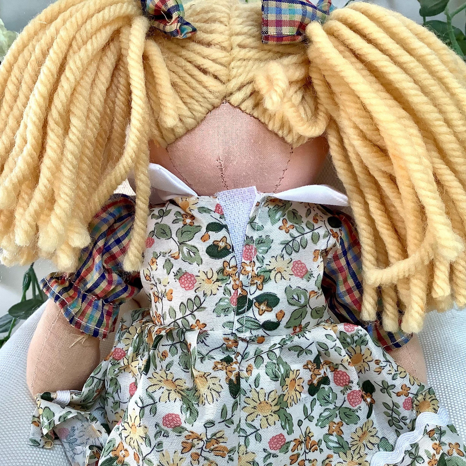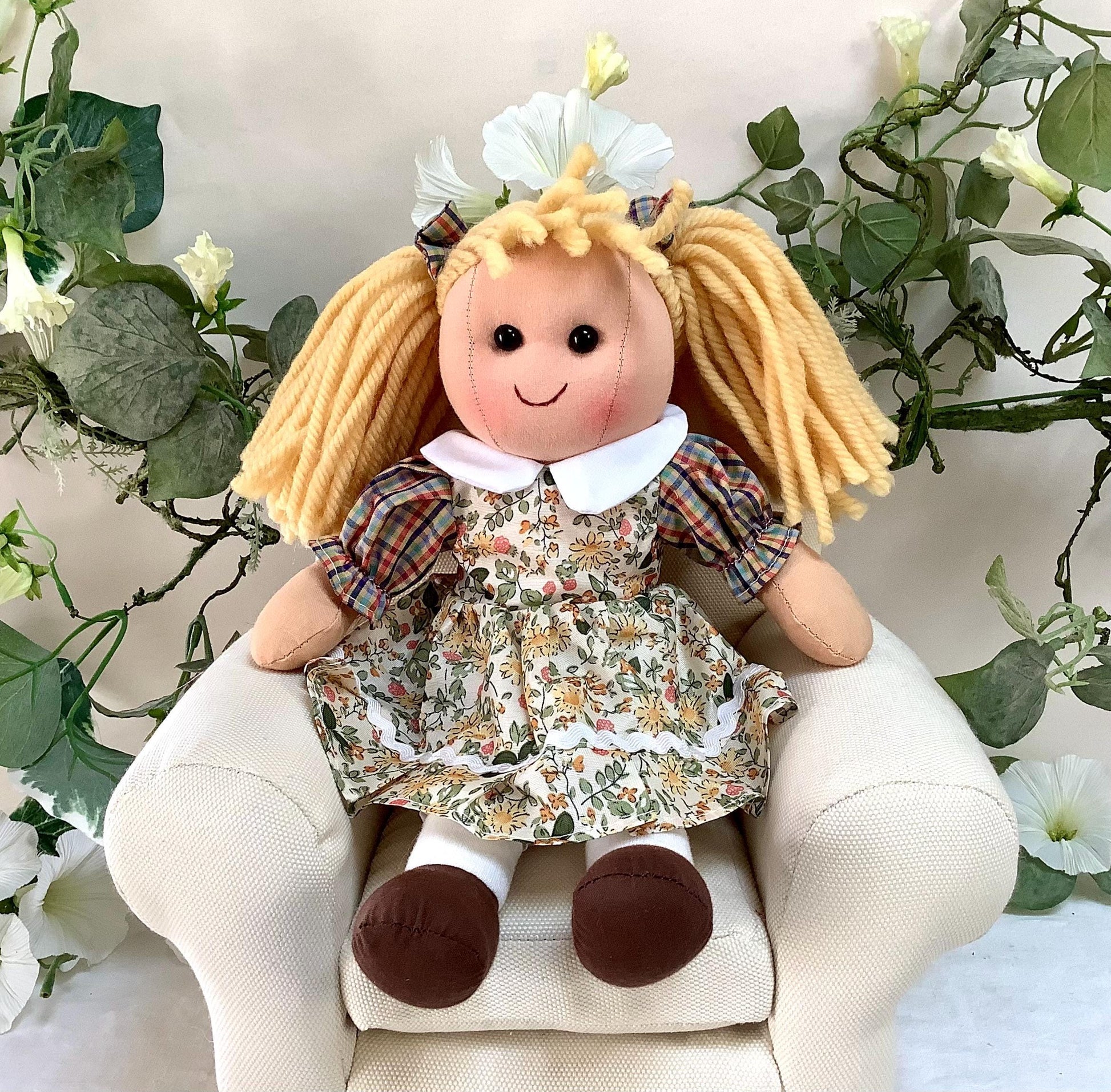 Poupée de chiffon en tissu modèle Dina. Les vêtement peuvent se retirer à l’exception des chaussons. Robe beige motifs fleuris, jolies finitions - 8 modèles différents - Normes CE