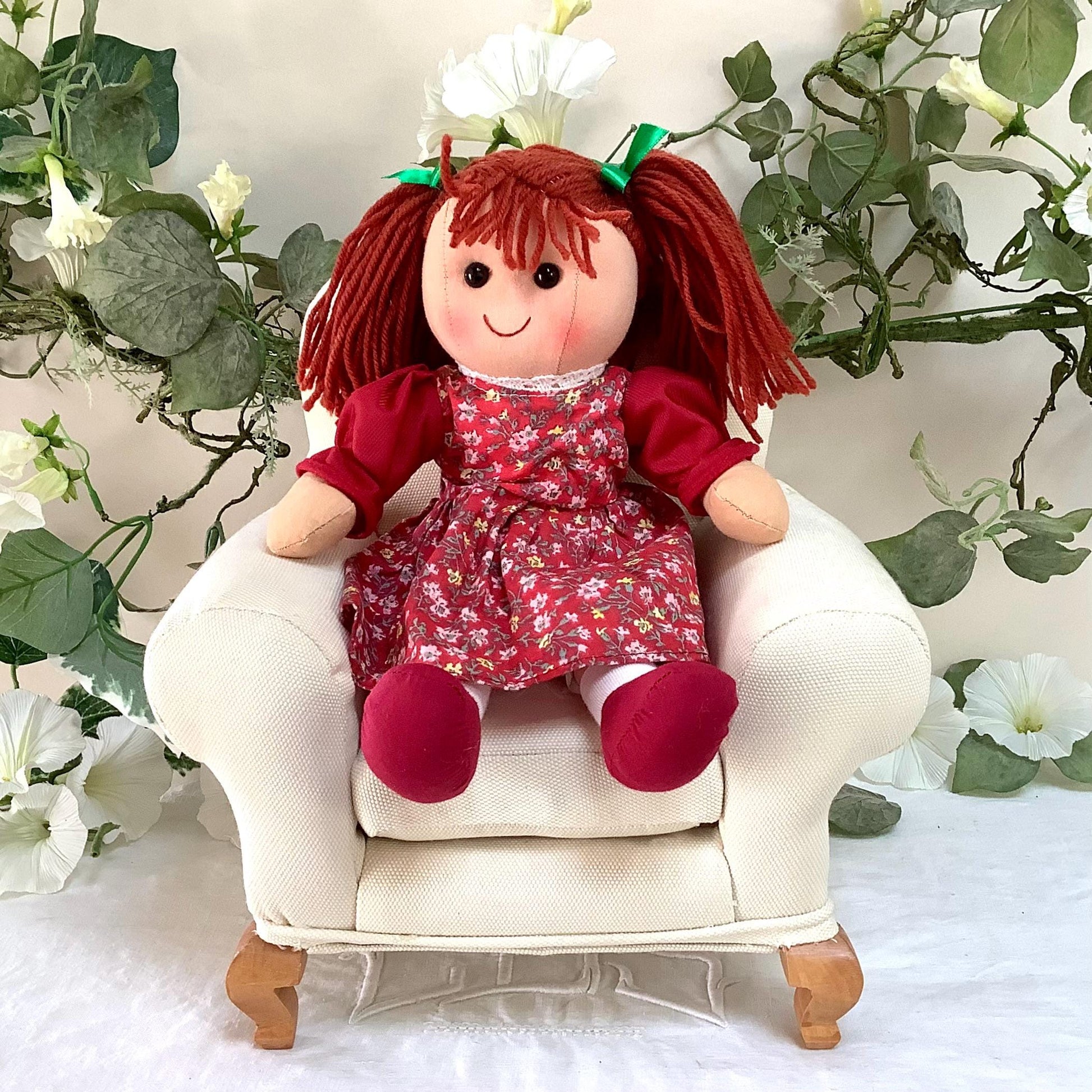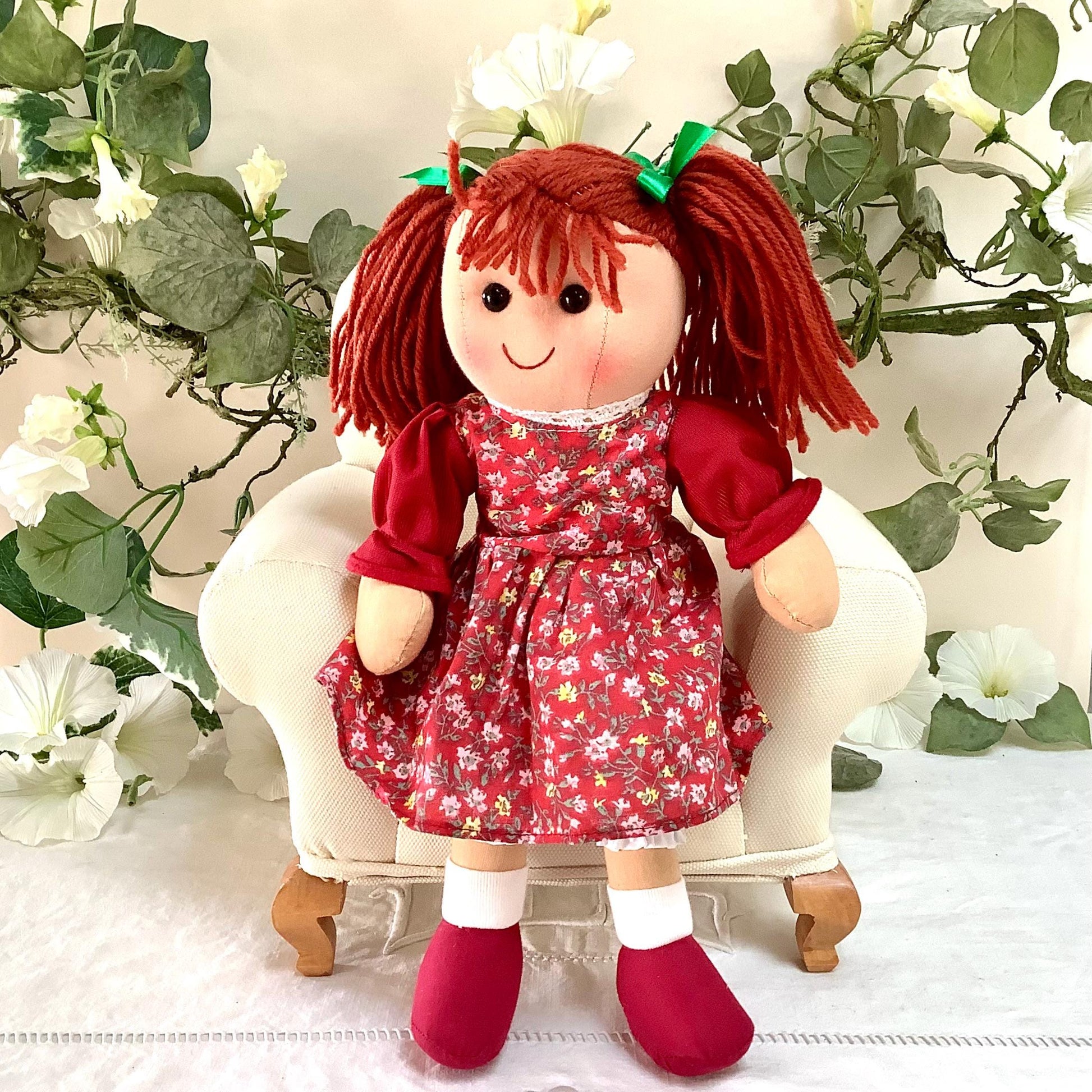 Poupée de chiffon en tissu modèle lili. Les vêtement peuvent se retirer à l’exception des chaussons. Robe rouge motifs fleuris, état neuf et jolies finitions - 8 modèles différents - Normes CE
