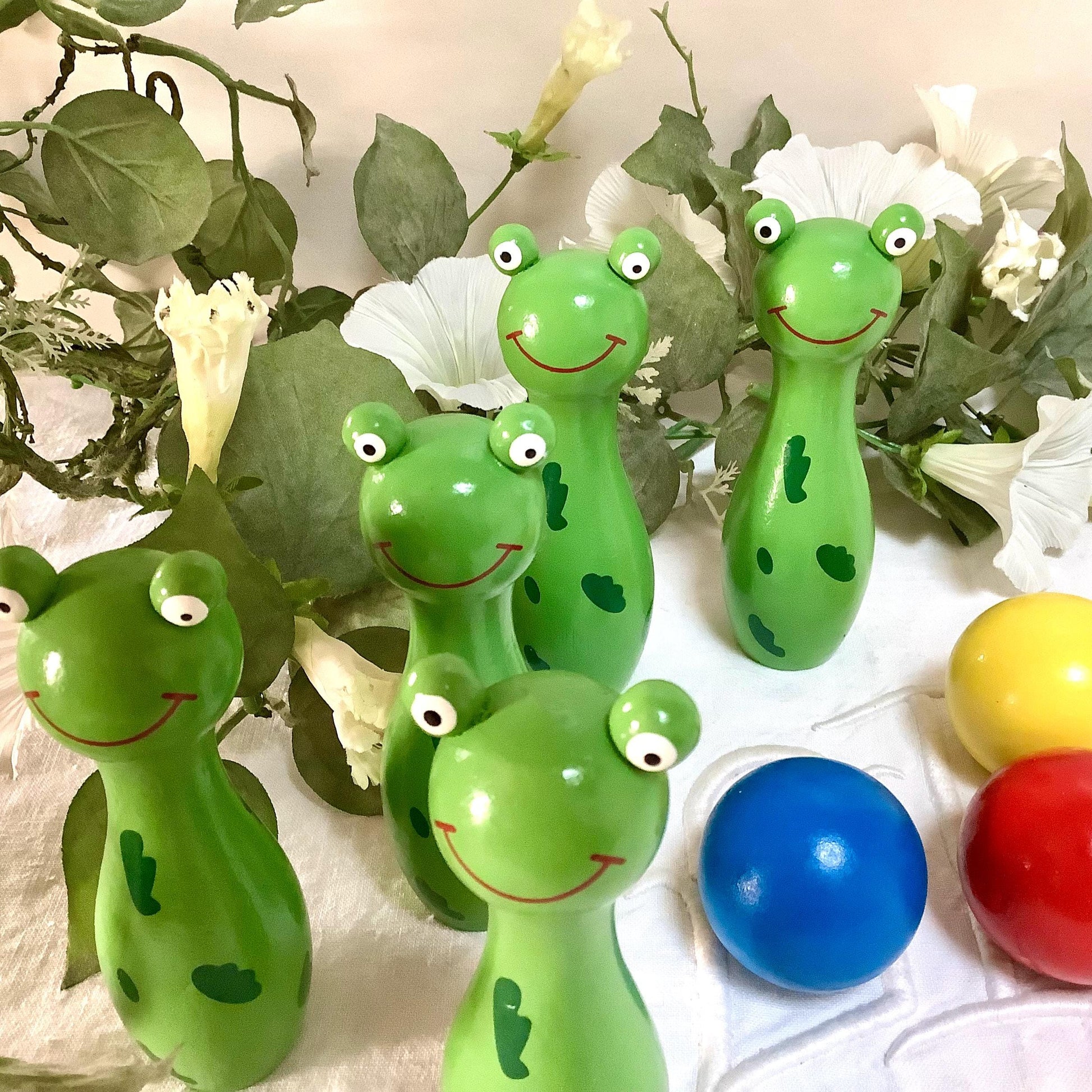 Jeu de quilles traditionnel avec un design grenouilles, adapté aux enfants à partir de 3 ans et fabriqué en bois robuste Le plaisir de jouer à l'intérieur et à l'extérieur. Boules et quilles en bois de taille pratique pour les enfants, entraîne les capacités motrices et la coordination œil-main quille