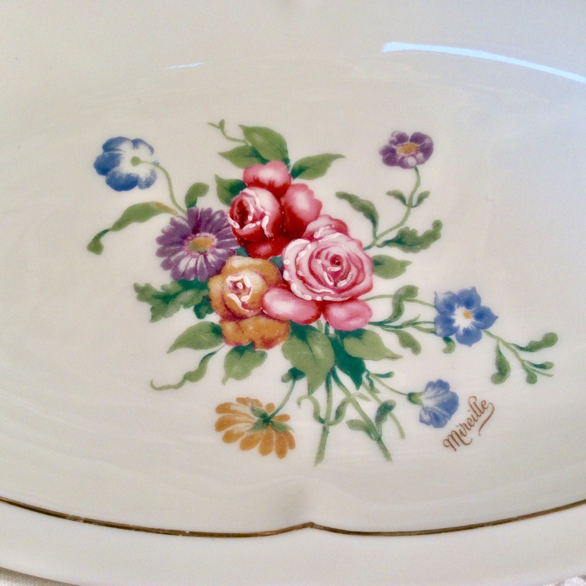 Un petit ravier en Porcelaine Charles Ahrenfldt modèle Mireille. Couleur blanc avec motifs floraux et liseré doré, très bon état