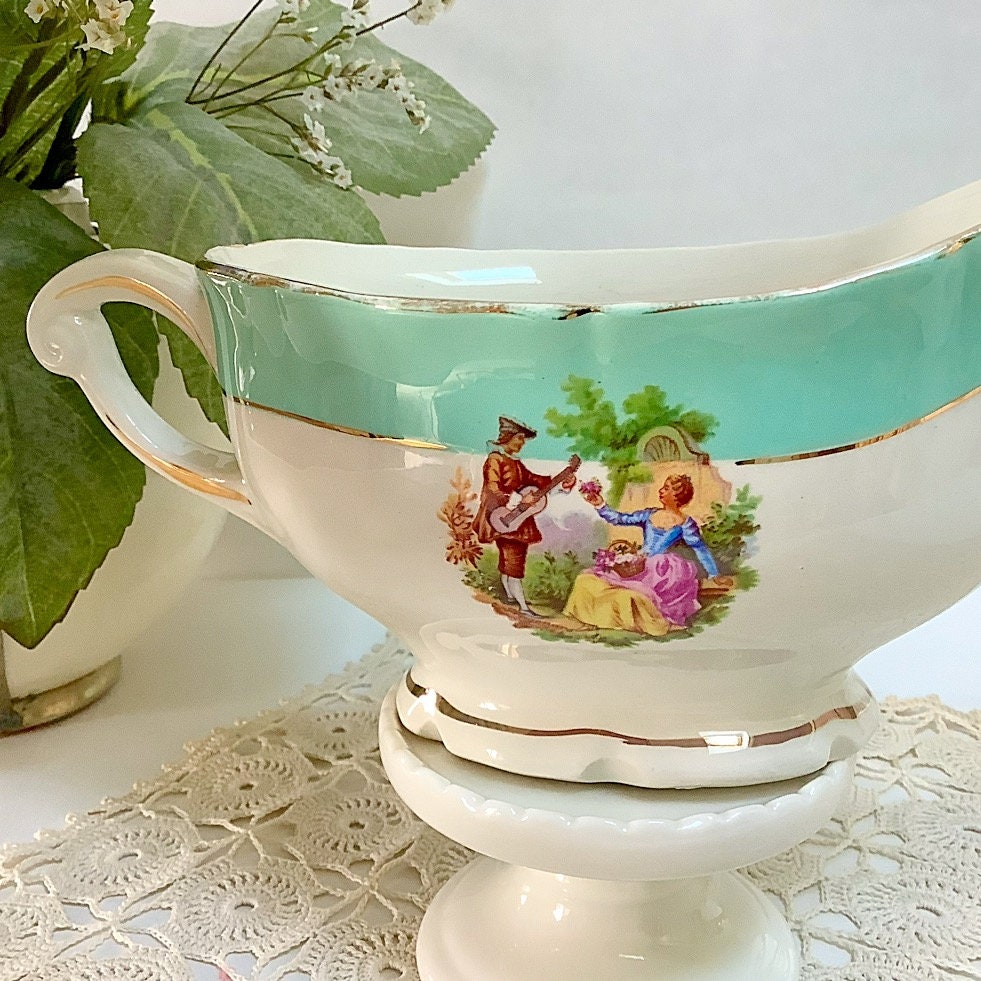 Une saucière ancienne en semi porcelaine Fragonard Ceranors France Saint Amand 1900 scène galante Bon état général à noter, liséré doré très estompé sur le pourtour supérieur. (voir photos)