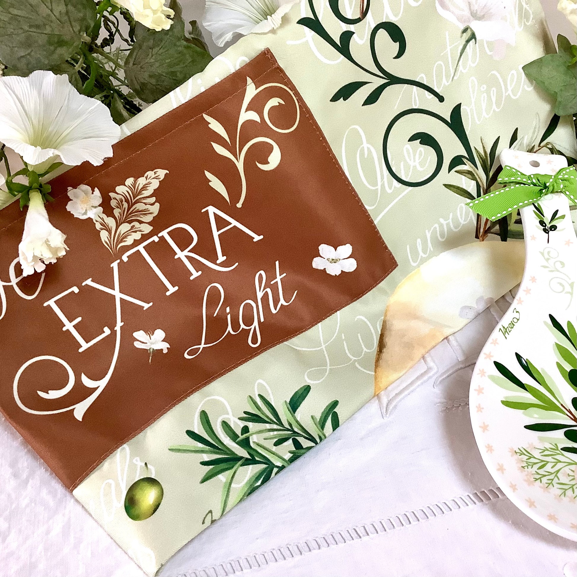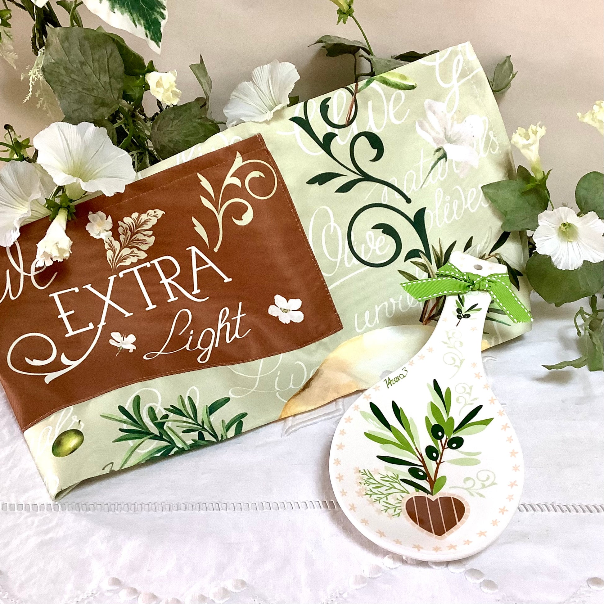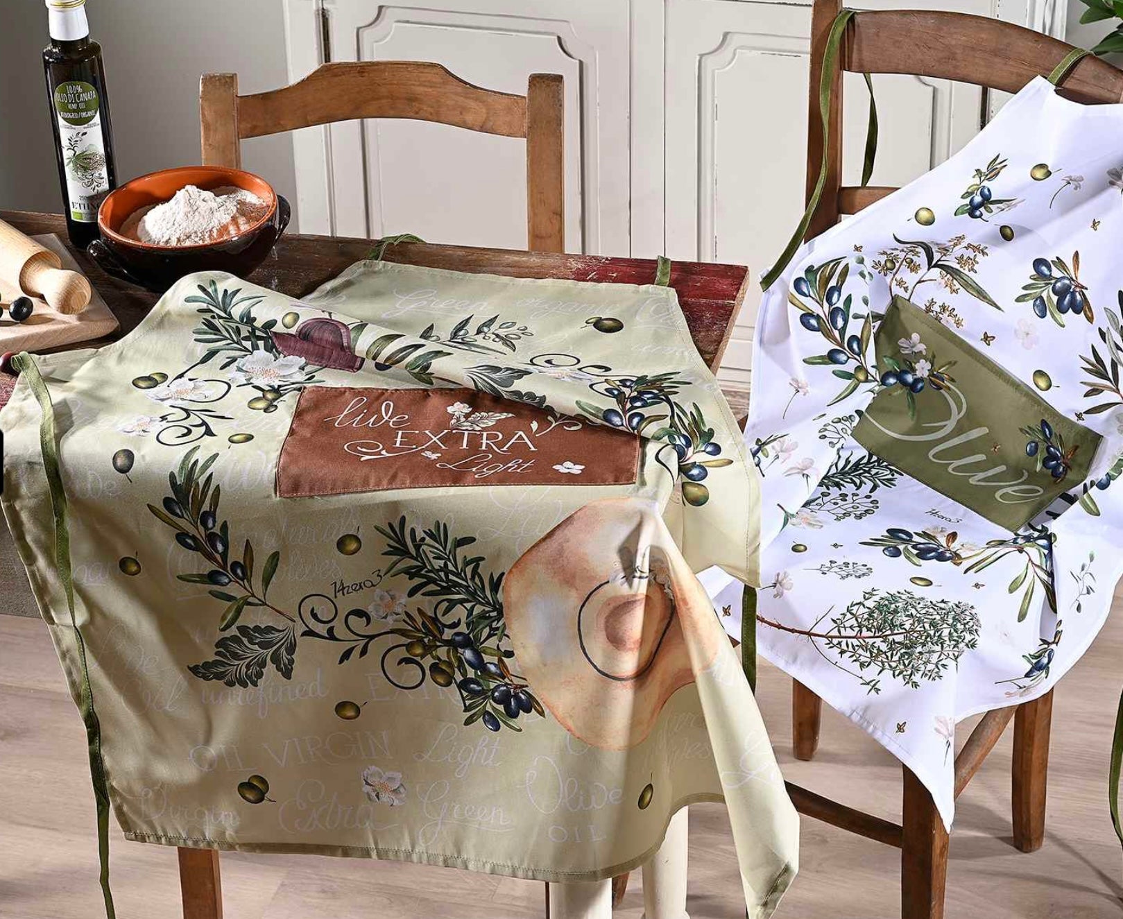 Ensemble avec tablier de cuisine en tissu imprimé olive avec poche avant et repose cuillère en céramique, décors en relief sur le thème olive